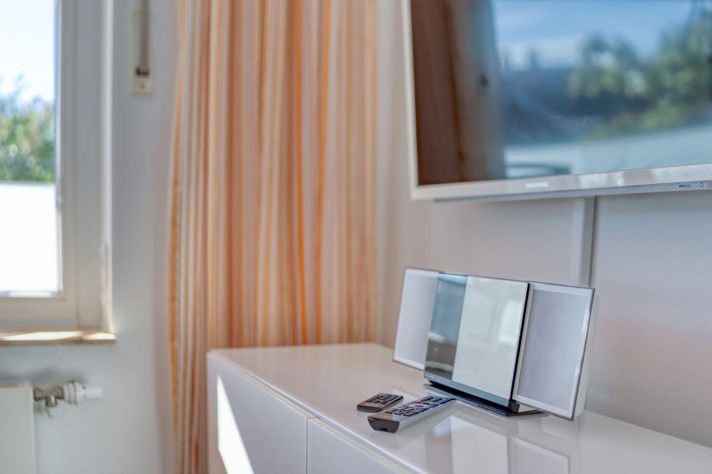 Das Wohnzimmer ist mit einem Kabel-TV (35–44 Zoll), Radio und DVD-Spieler ausgestattet und lädt zu entspannten Abenden ein. WLAN ist selbstverständlich verfügbar. Bücher bieten zusätzliche Unterhaltung.