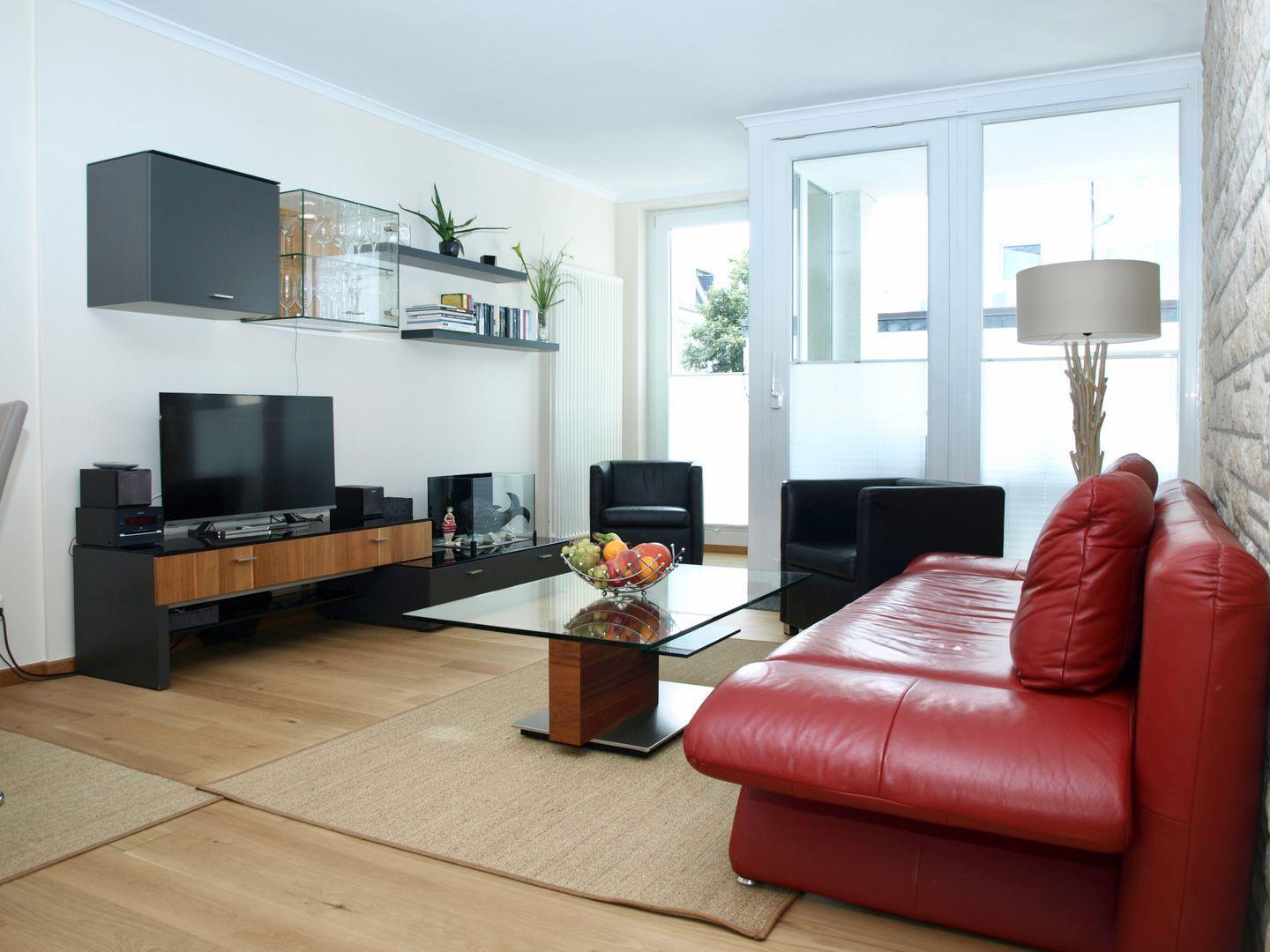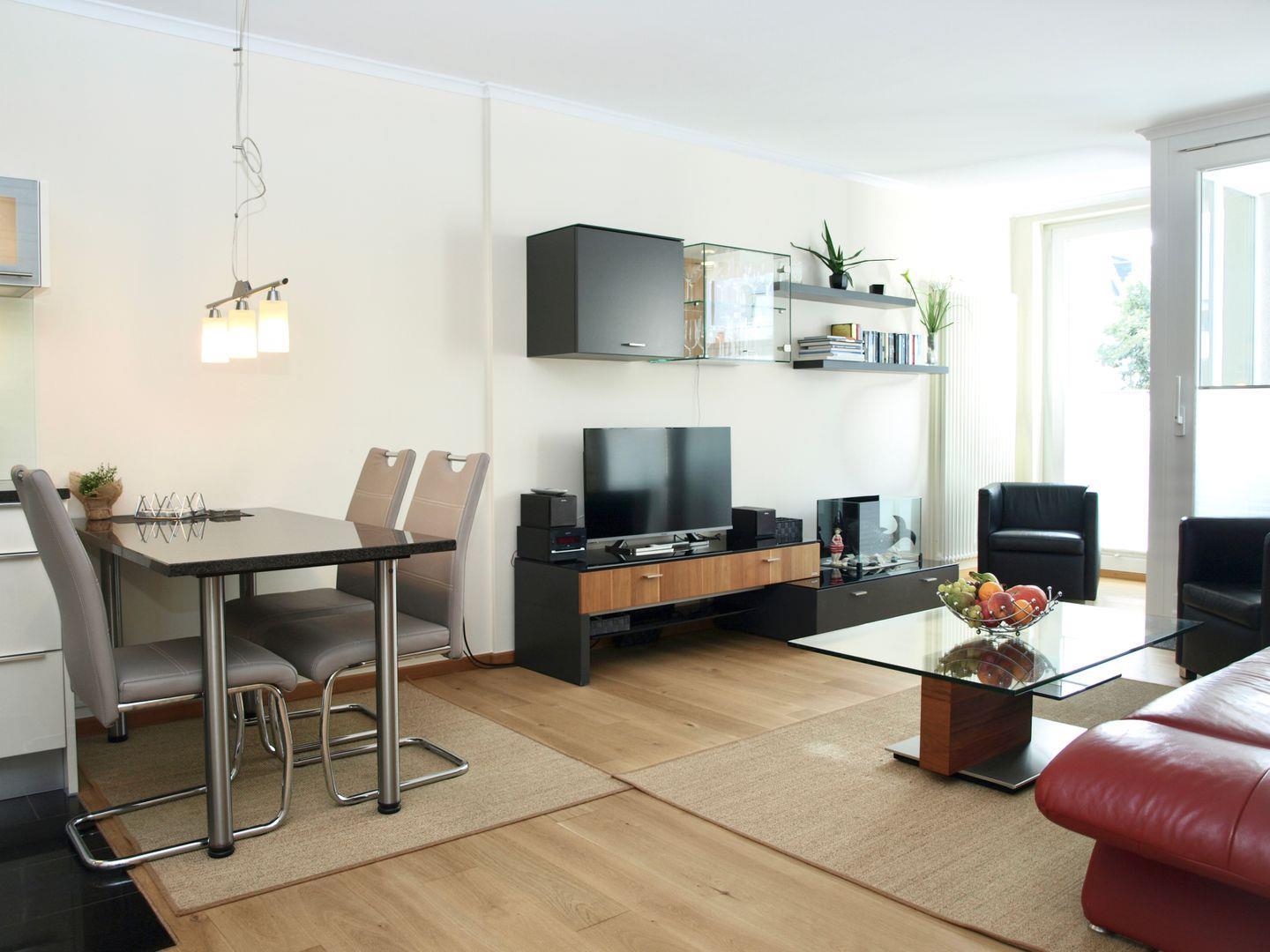 Genießen Sie unbeschwerte Urlaubstage in dieser stilvollen 2-Zimmer-Wohnung im Düsseldorfer Hof. Auf rund 58 m² erwartet Sie moderner Komfort mit separatem Schlafzimmer, großzügigem Wohnbereich samt Küchenzeile und einem geschützten West-Balkon – perfekt, um die Sonne am Nachmittag zu genießen.