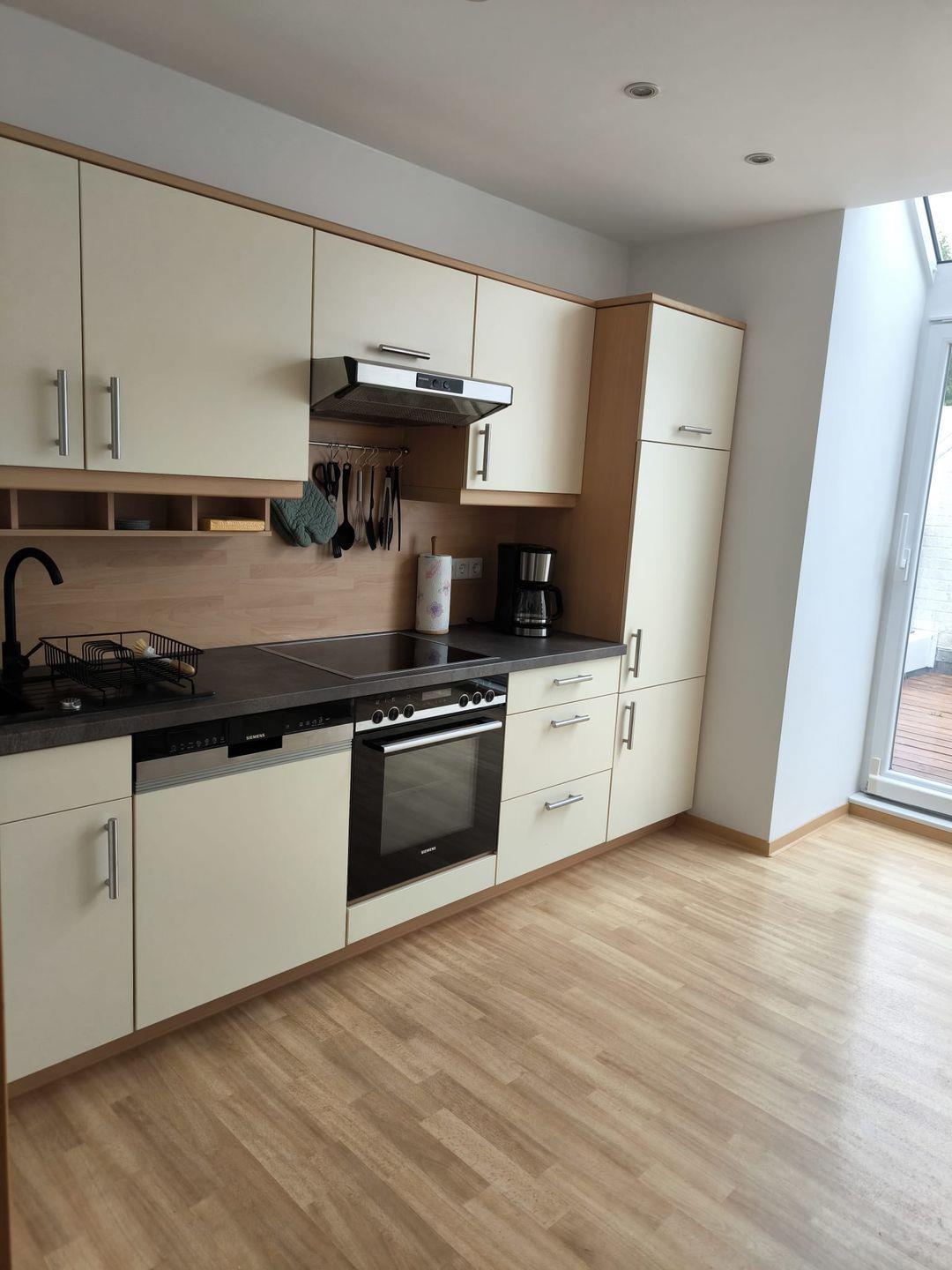 Über die Treppe direkt im Eingangsbereich erreichen Sie den Wohnbereich mit Küche in der 1. Etage. Eine Terrasse geht direkt vom Wohnzimmer ab.