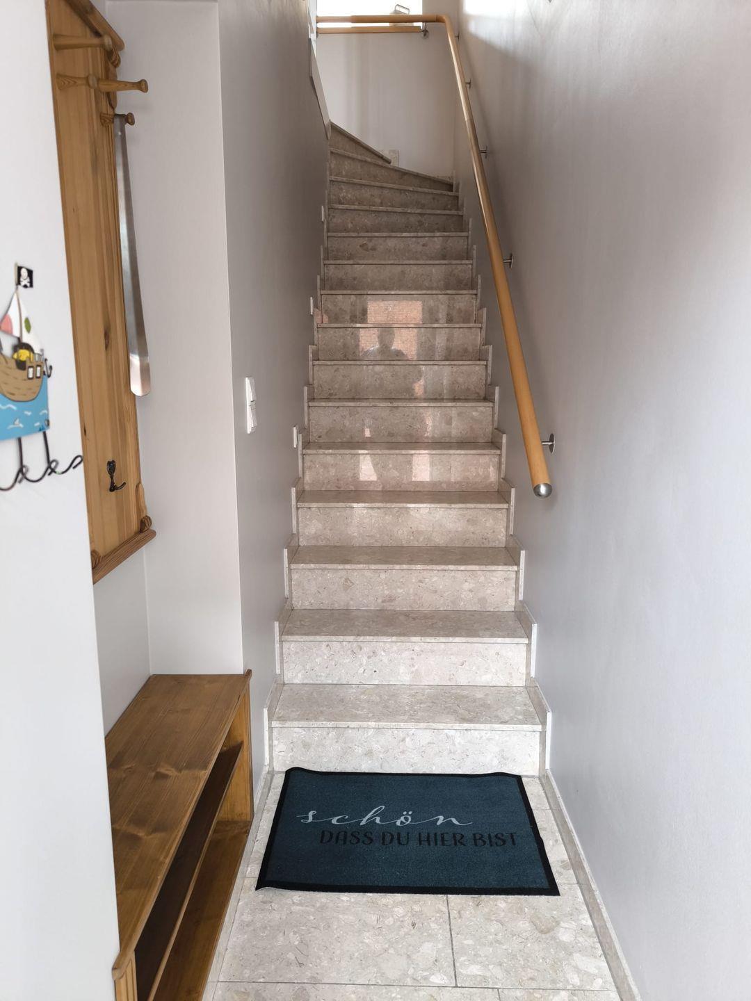 Über die Treppe direkt im Eingangsbereich erreichen Sie den Wohnbereich mit Küche in der 1. Etage. Weiter in der 2. Etage befinden sich die 2 Schlafzimmer.