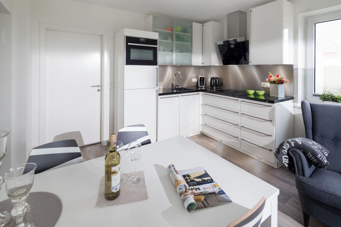 Offene Küche mit Geschirrspüler, Backofen, Mikrowelle, Kaffeemaschine und kompletter Ausstattung