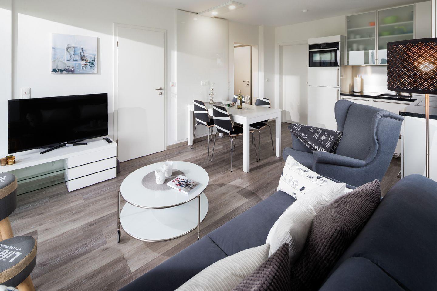Die Wohnung ist für zwei Personen ausgelegt und bietet alles, was man für eine entspannte Auszeit am Meer braucht:
