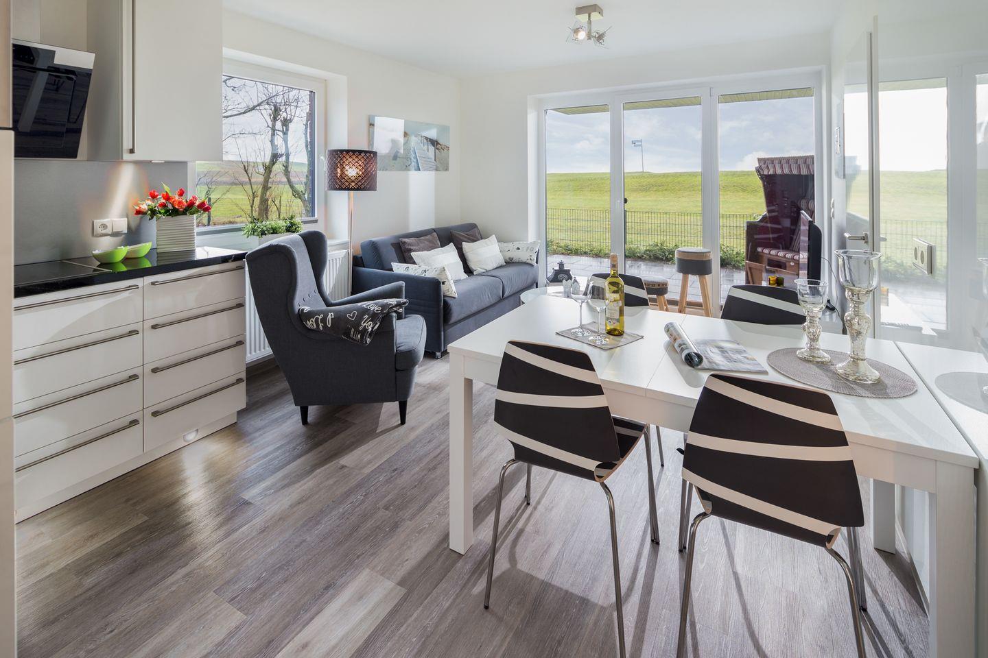 Moderne Ferienwohnung Deichblick 1 direkt am U-Deich mit Terrasse, Strandkorb und Meerblick für eine entspannte Auszeit zu zweit.