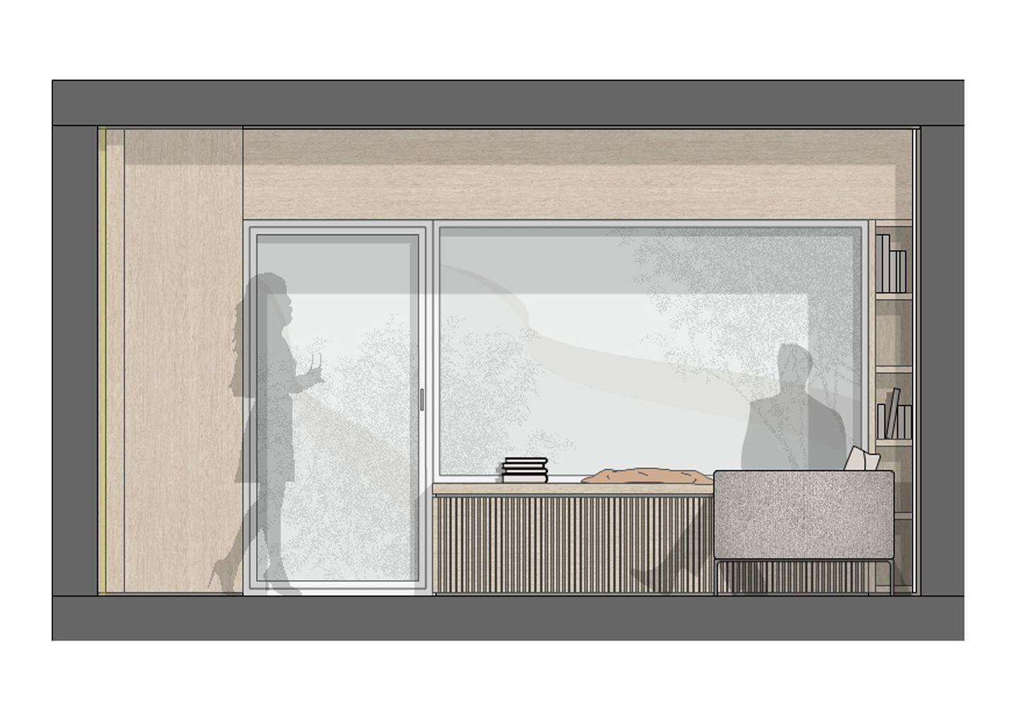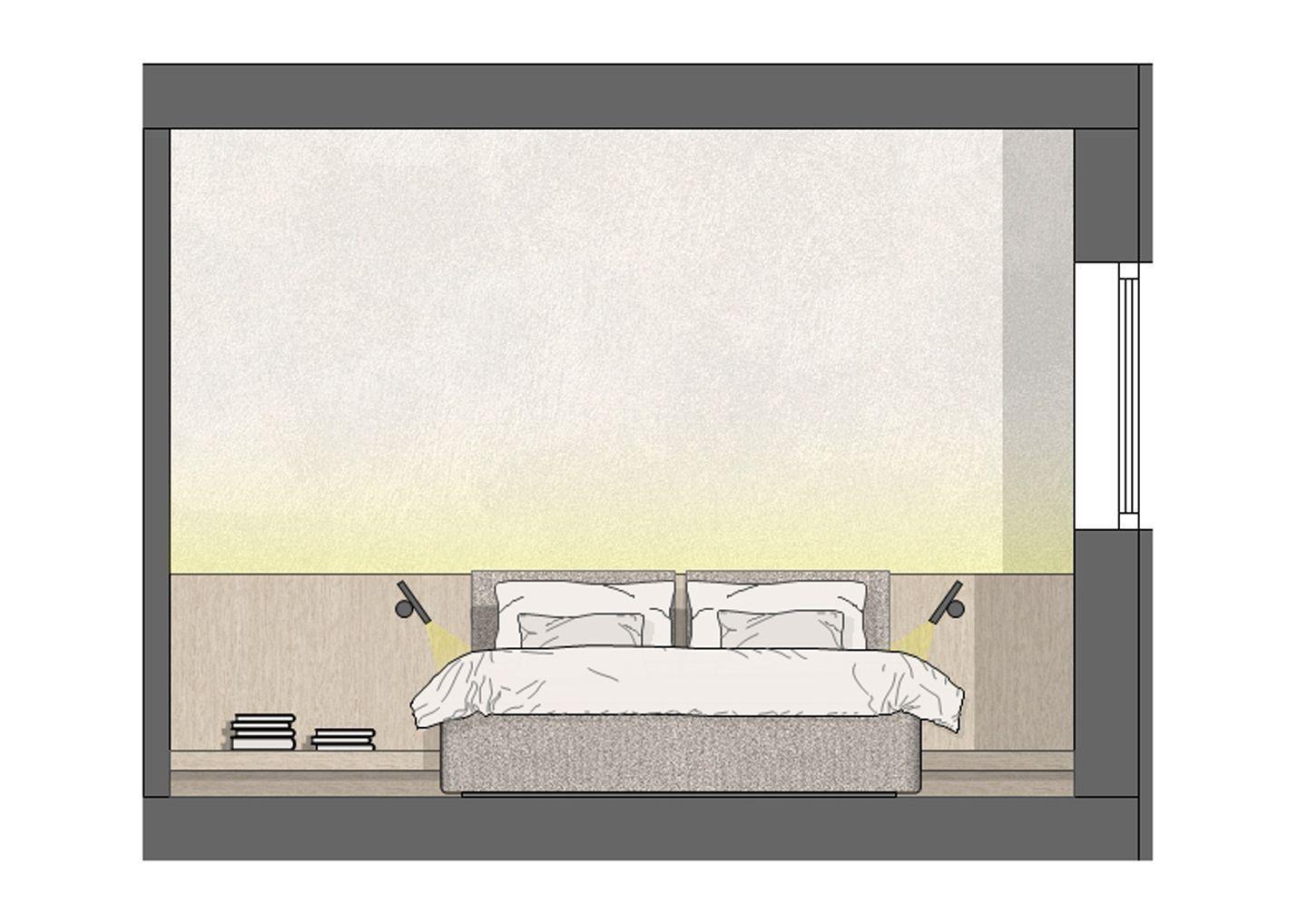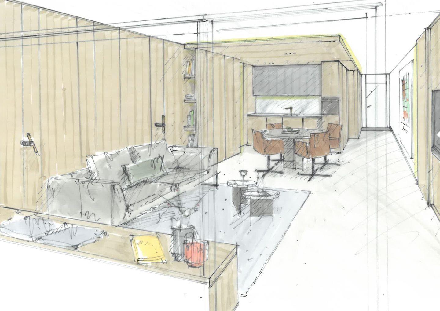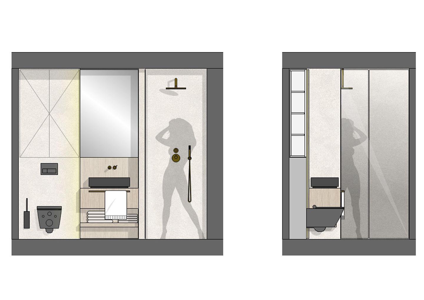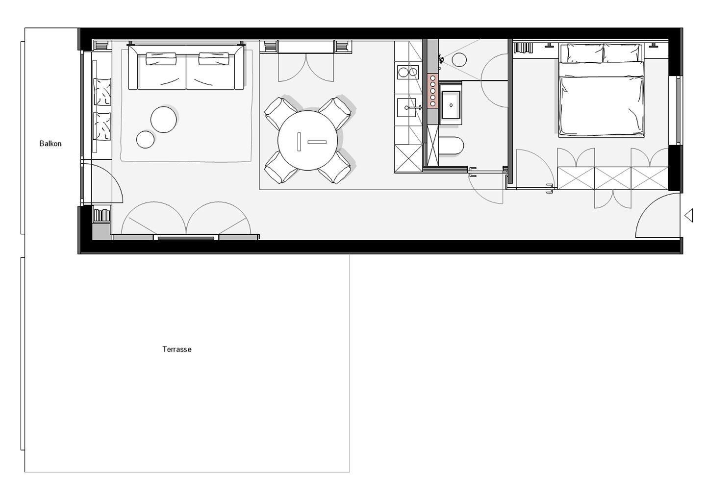 Im Inneren setzt die Wohnung auf klare Linien, hochwertige Materialien und eine moderne, zurückhaltende Gestaltung. Wände und abgehängte Decke sind in ausgewählten Bereichen mit Fichte natur verkleidet – für eine warm-ruhige Atmosphäre und ein stimmiges Gesamtbild. Alle Möbel entstehen als maßgefertigte Einbaumöbel aus der Tischlerei: flächenbündig, stauraumstark und visuell reduziert. Alles ist auf entspannte Aufenthalte ausgelegt – ein privater Rückzugsort über der City.