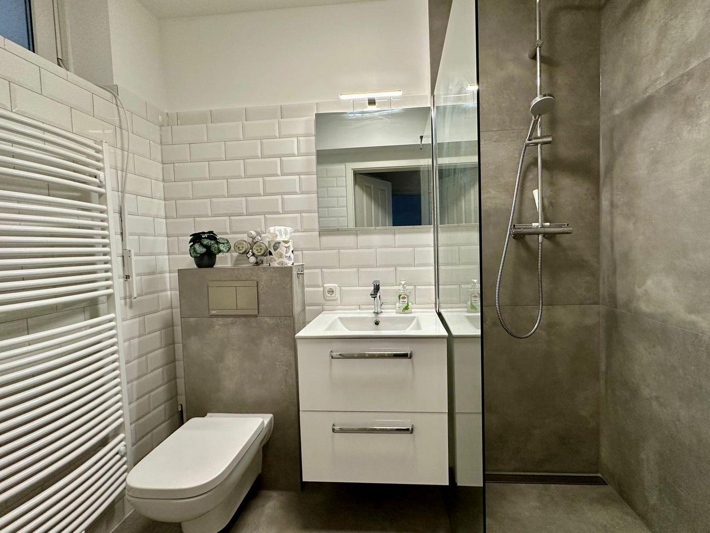 Das moderne Badezimmer verfügt über Dusche und WC.