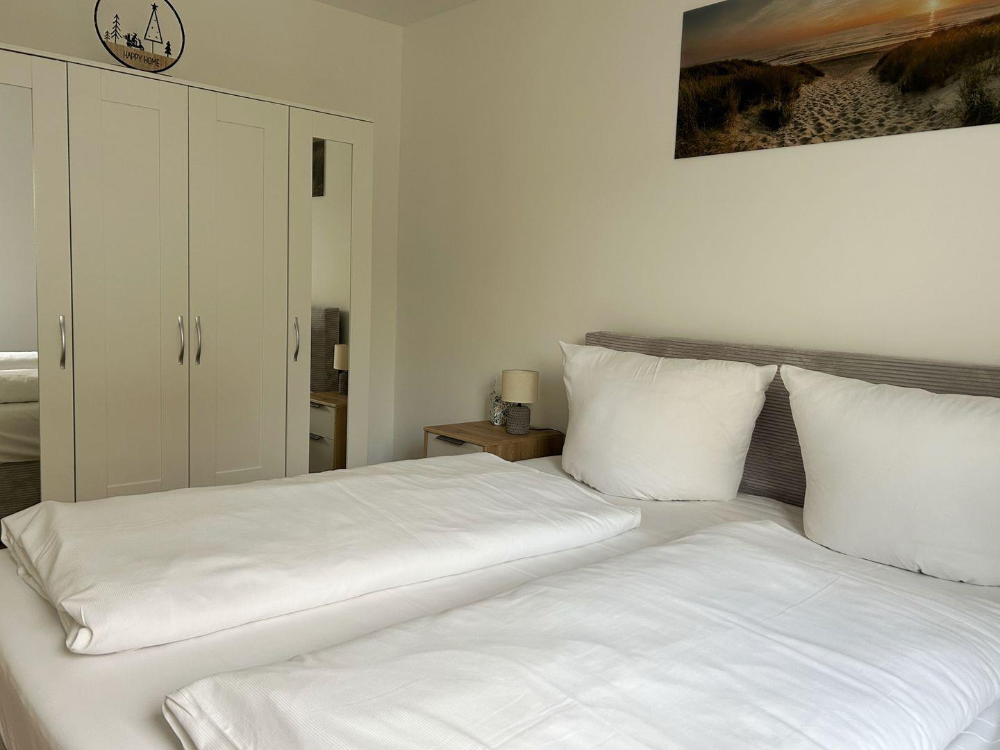 Diese großzügige und modern eingerichtete Zwei-Raum-Ferienwohnung im 1. Obergeschoss lädt zum Wohlfühlen ein. Im separaten Schlafzimmer erwartet Sie ein komfortables Doppel-Boxspringbett sowie ein eigener Fernseher – ideal für entspannte Stunden. Der offene Wohnbereich ist mit gemütlichem Sofa, TV und einem einladenden Essbereich ausgestattet. Eine praktische Nische mit zwei Einzel-Boxspringbetten bietet zusätzlichen Schlafkomfort für Familie oder Freunde.