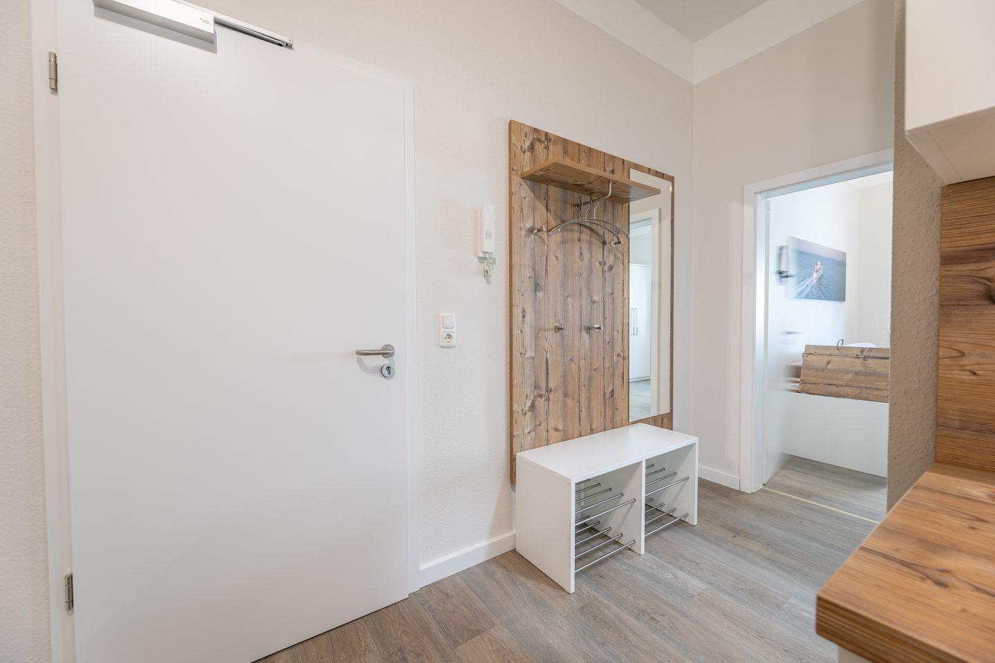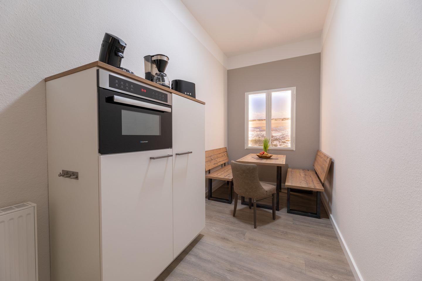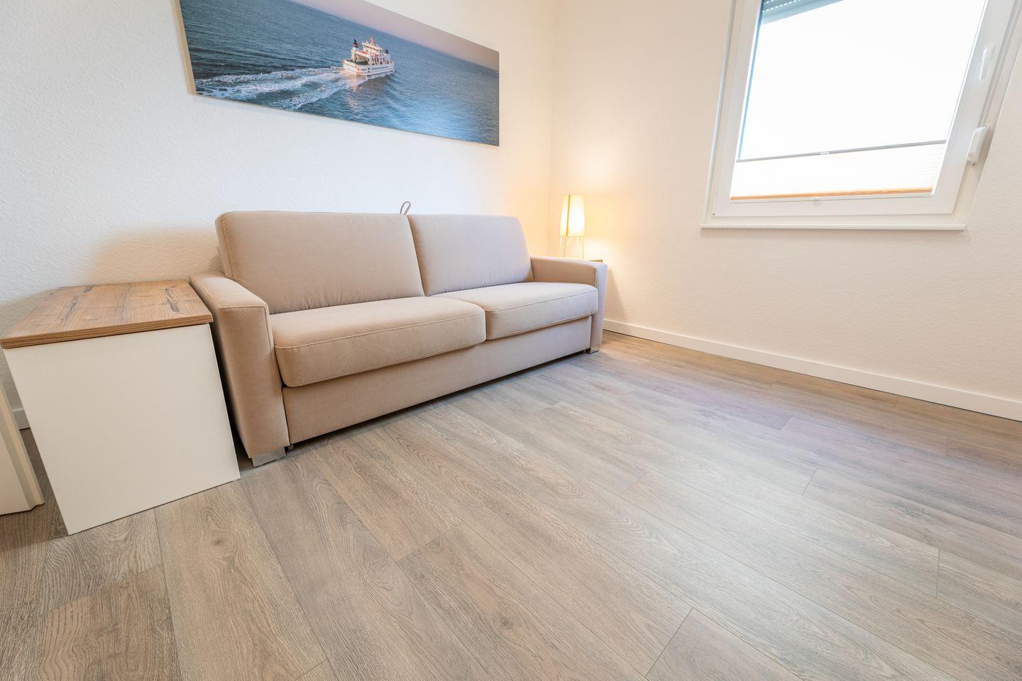 Moderne 1-Zimmer-Ferienwohnung auf Norderney mit maritimem Stil und gemütlichem Wohn-/Schlafbereich.