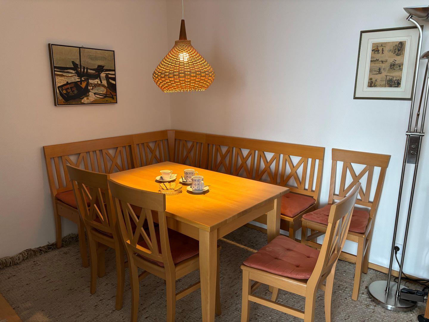Die Wohnung bietet 3 Zimmer, ein Elternschlafzimmer mit Doppelbett und ein Kinderzimmer mit Etagenbett. Im Wohn- Eßbereich befinden sich 2 bequeme Sessel und eine Couch, ebenso eine Essecke mit Tisch und Stühlen. Die angrenzend offene Küche bietet alles was man benötigt. Das Badezimmer ist mit Dusche/WC ausgestattet. Internet per WLAN steht Ihnen für Ihren Aufenthalt kostenlos zur Verfügung. Waschmaschine und Trockner können Sie kostenpflichtig im Haus nebenan im EG nutzen.