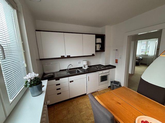 Das Wohnzimmer ist mit einer Kommode und einem Sofa ausgestattet. Die geschlossene, vollwertig eingerichtete Küche bietet alles, was Sie für eine unkomplizierte Selbstversorgung benötigen: einen 4-Platten-Herd (elektrisch), Backofen, Kühlschrank mit Gefrierfach, Kaffeemaschine, Wasserkocher, Toaster, Eierkocher sowie ausreichend Kochutensilien, Geschirr und Besteck. Geschirrhandtücher, Abfalleimer und ein Staubsauger stehen ebenfalls bereit.