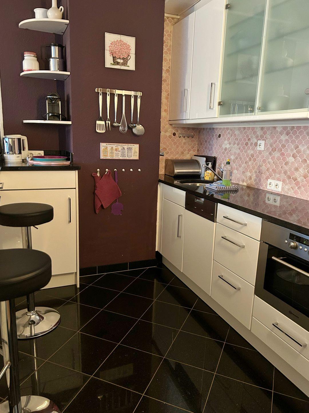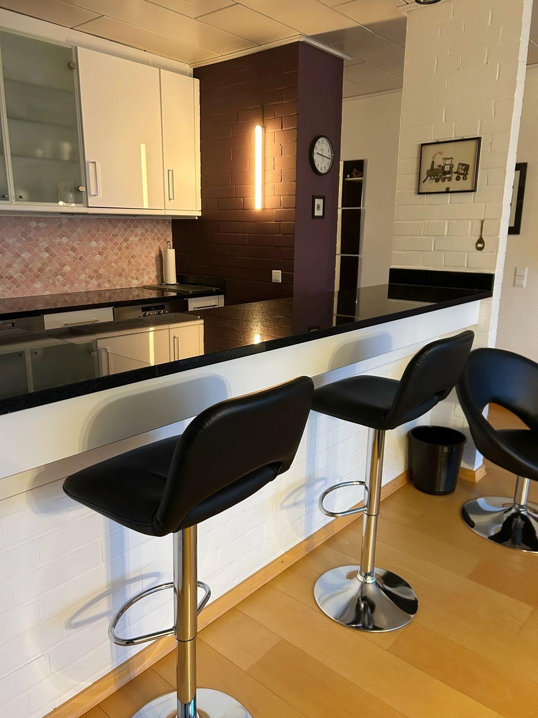 Diese geschmackvoll eingerichtete Ferienwohnung im Dachgeschoss bietet ein gemütliches Wohnzimmer mit großer Sofalandschaft, TV und Zugang zum Balkon. Die moderne, offene Küchenzeile mit Bar lädt zum gemeinsamen Kochen und Genießen ein.