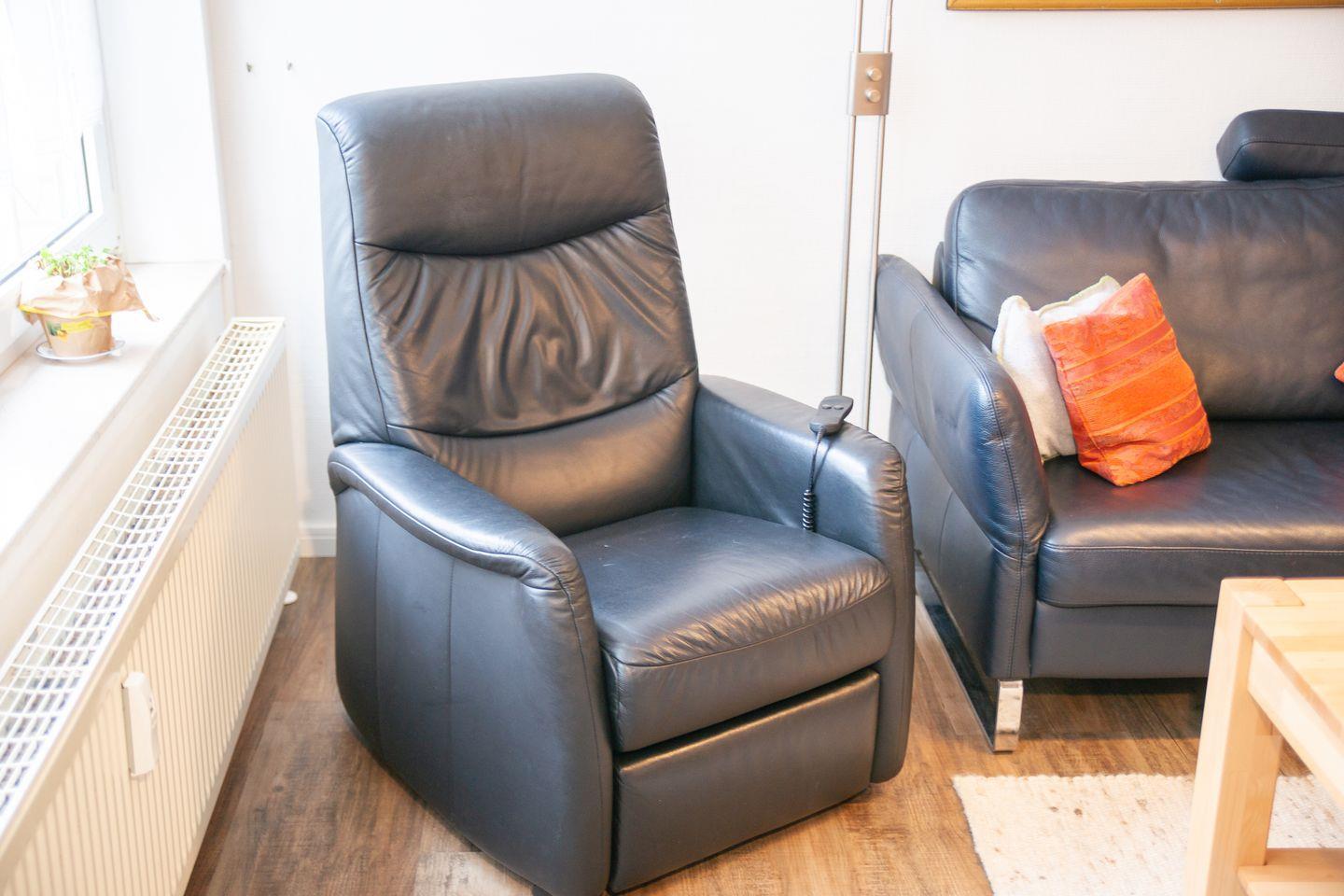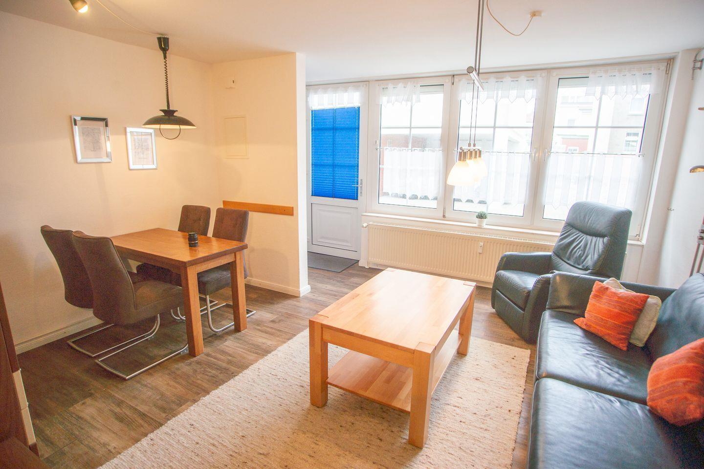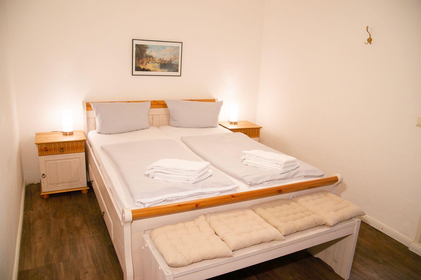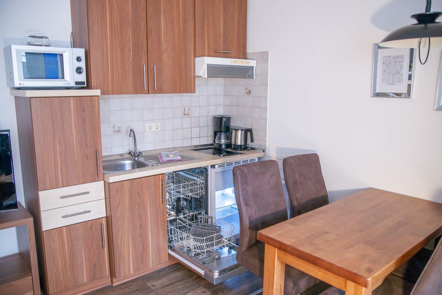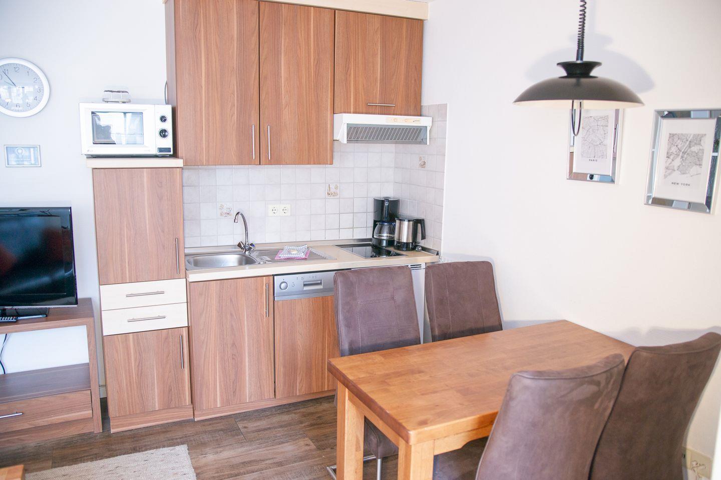 der Wohn-Schlafraum ist ausgestattet mit kleiner Küchenzeile, Essecke und Sofa. Im hinteren Bereich ist eine abgetrennte Schlafnische mit Doppelbett. Badezimmer mit Dusche/WC. Kein Wlan. Bäcker, Lebensmittelgeschäfte in der Strandstraße und die Strandpromenade sind um zwei Straßenecken fußläufig zu erreichen. Das Appartement verfügt über einen separaten Eingang.