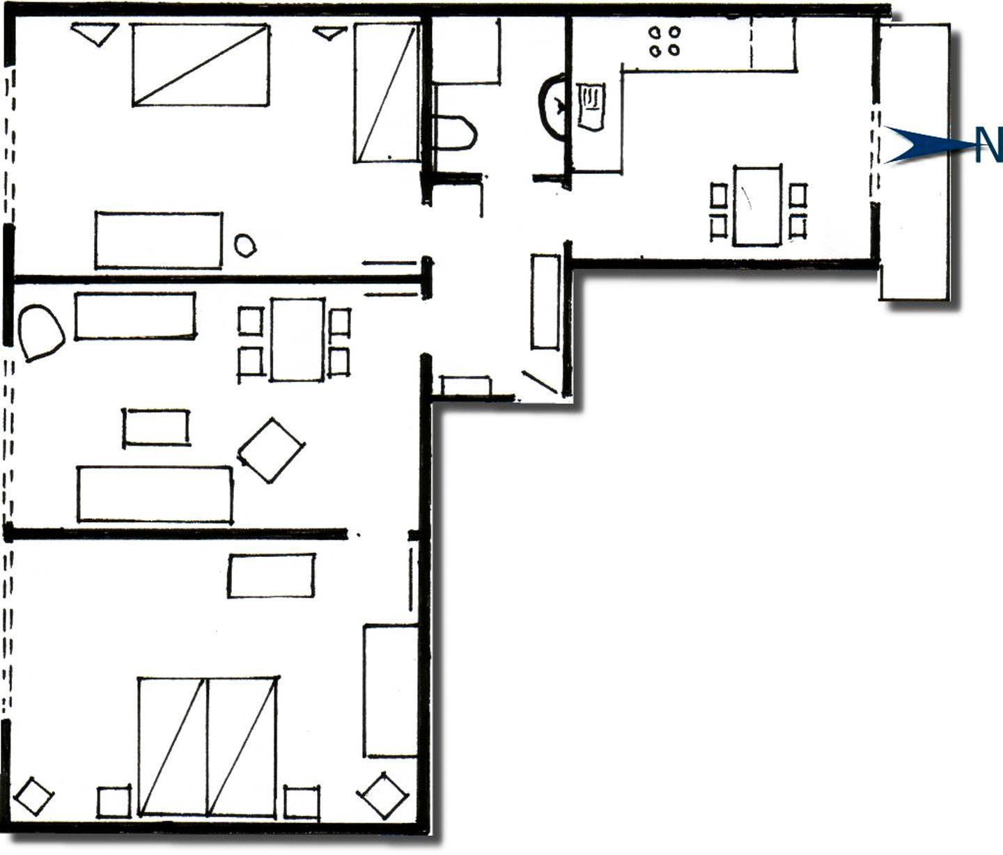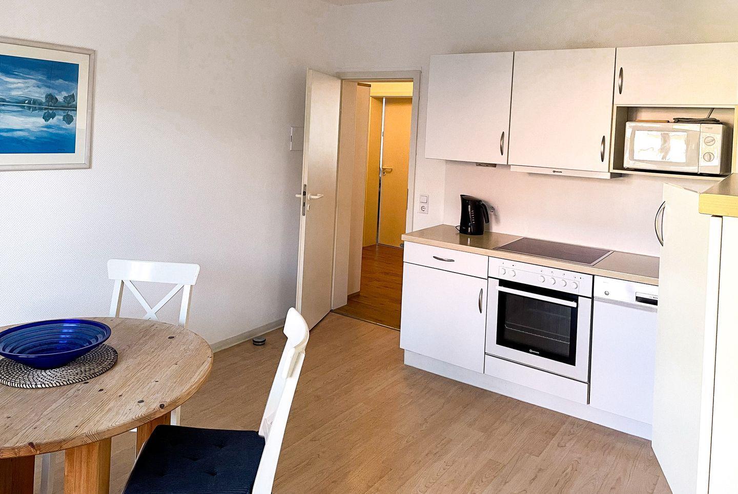 das geräumige Appartement im 1. OG verfügt über 2 separate Schlafzimmer (eines mit Doppel-/eines mit 2 Einzelbetten). Durch die separate voll ausgestattete Küche mit rundem Esstisch vor dem Fenster betreten Sie den Balkon, der nach hinten raus liegt. Badezimmer mit Dusche/WC. Im Wohnzimmer befindet sich eine zweite Essecke vor dem Fenster.