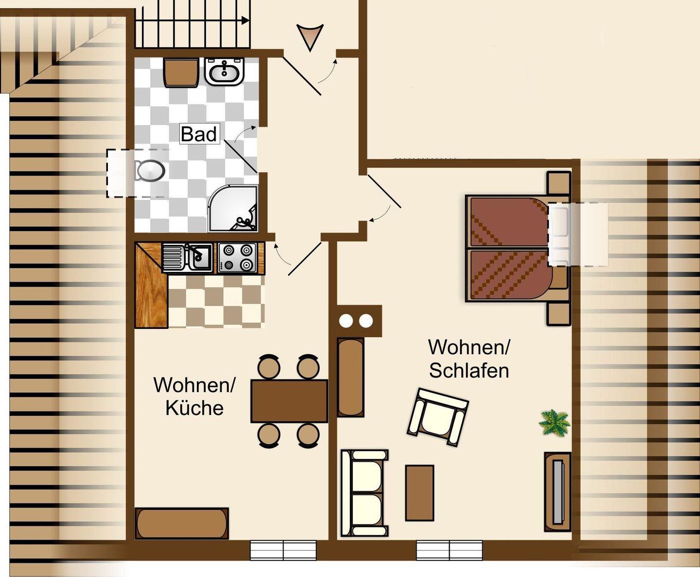 der geräumige Wohn-Schlafraum bietet Platz für ein feststehendes Doppelbett (1,80 x 2,00m) und eine kleine Sofaecke. Eine Essecke befindet sich in der separaten Küche. Das Tageslichtbad hat Dusche/WC. Im Haus befinden sich 2 weitere Ferienwohnungen. Lebensmittelgeschäft und Bäcker sind um zwei Ecken schnell fußläufig zu erreichen.
