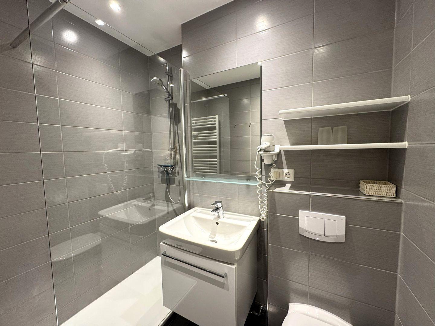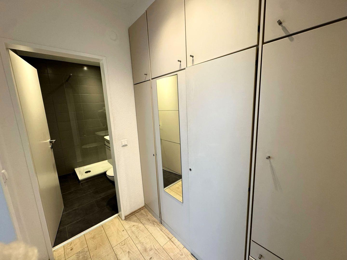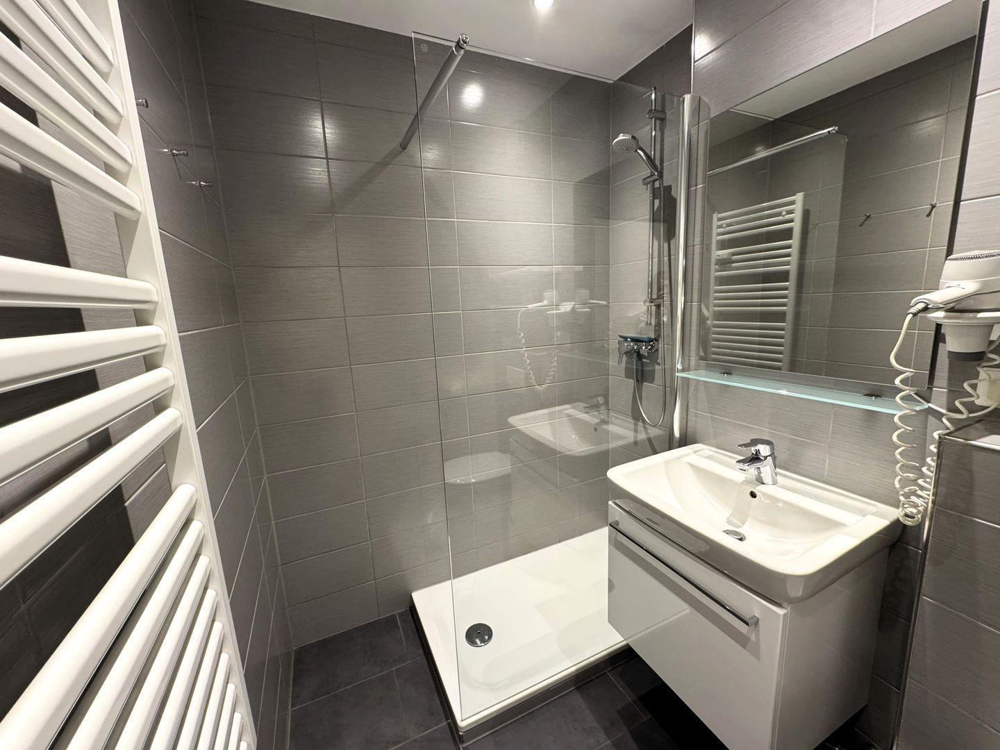 Das moderne Badezimmer überzeugt mit einer ebenerdigen Dusche und klarer, zeitgemäßer Gestaltung. Zudem bietet die Wohnung viel Stauraum für einen angenehmen Aufenthalt auch über mehrere Tage.