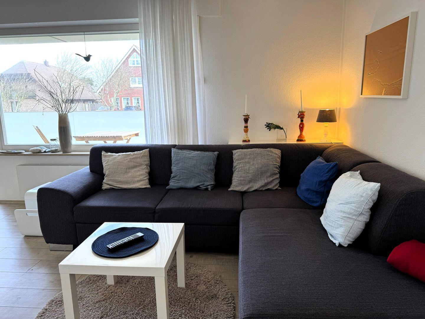 Der helle Wohnraum ist mit einem komfortablen Schranksofa und einer gemütlichen Sofaecke ausgestattet – perfekt zum Entspannen nach einem Tag am Meer. Ein Balkon mit östlicher Ausrichtung lädt zum Frühstück in der Morgensonne oder zum ruhigen Lesen bei frischer Nordseeluft ein.