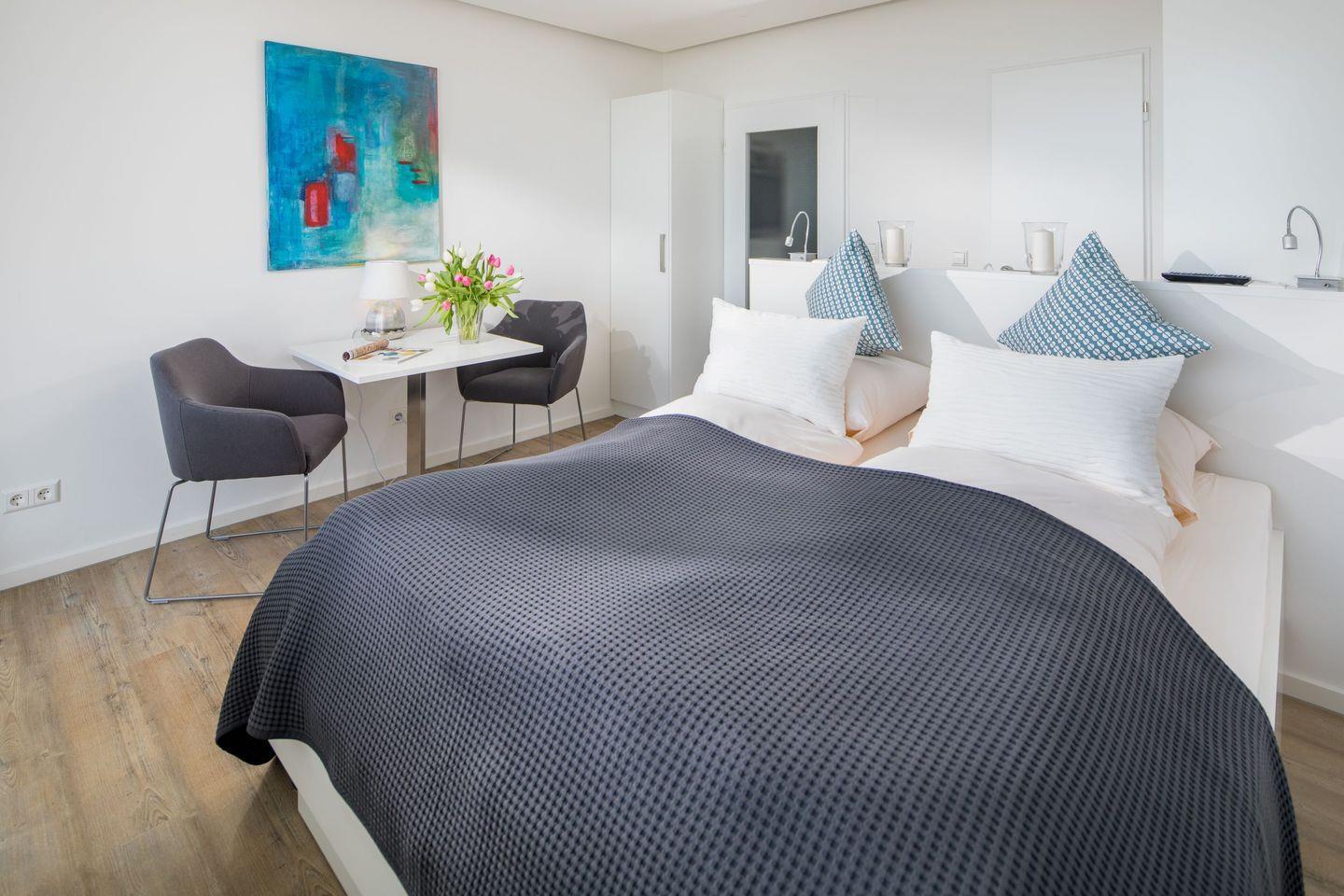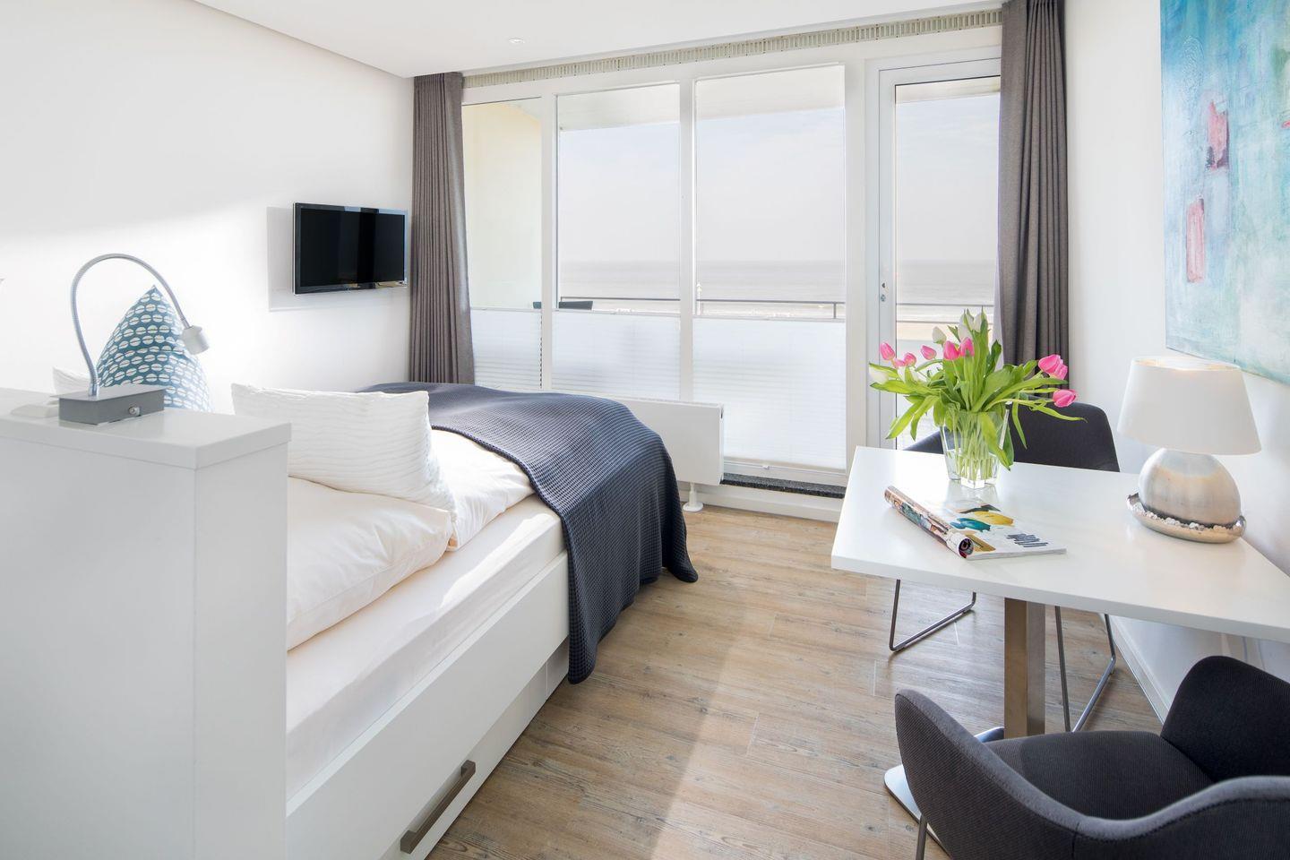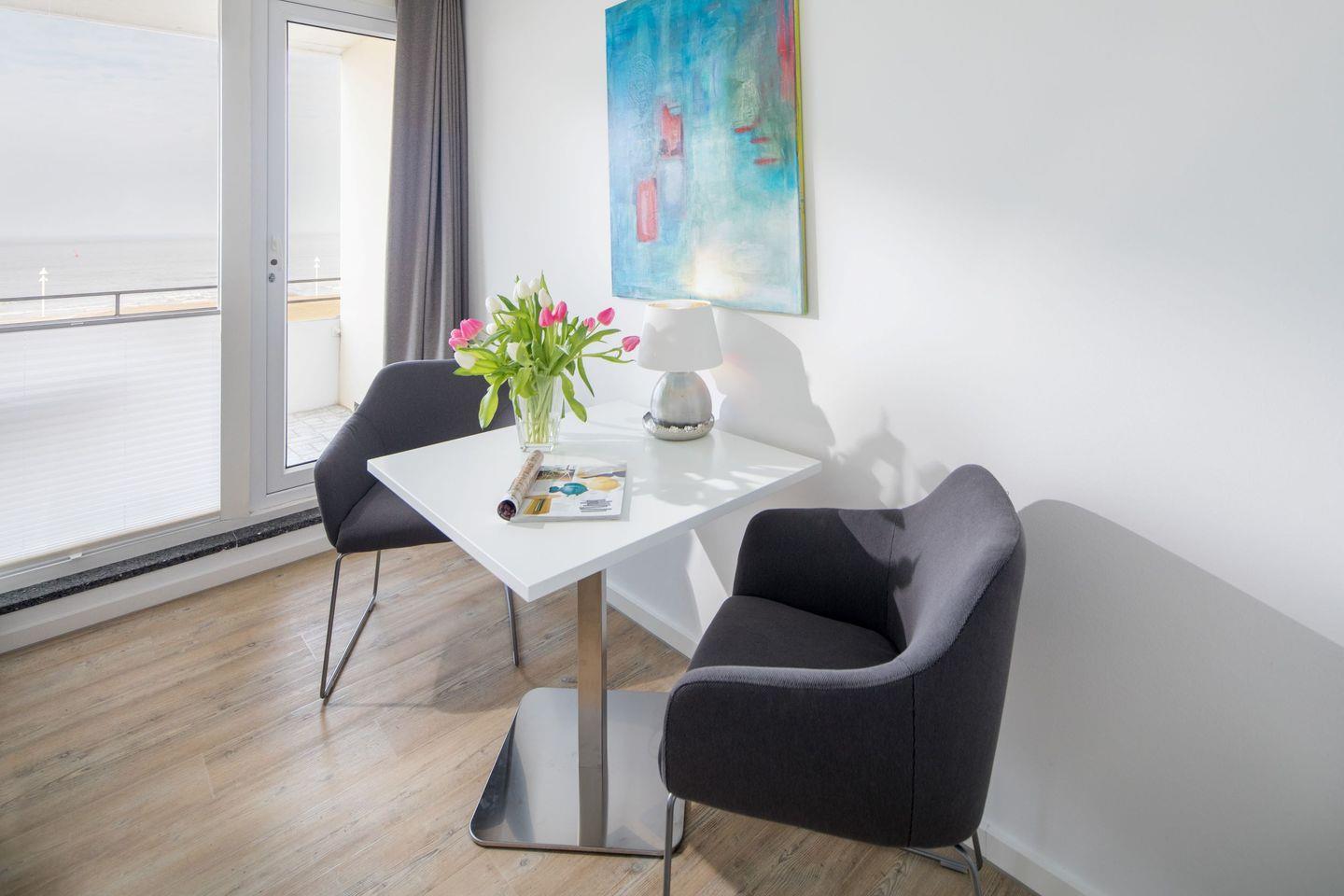 der Wohnraum ist ausgestattet mit feststehendem Doppelbett und Essplatz. Daran anschließend befindet sich der Balkon mit herrlichem Blick über die Kaiserwiese auf die offene Nordsee. Die Küchenzeile ist separat im Durchgang zum Badezimmer mit Dusche/WC. Fahrstuhl vorhanden.