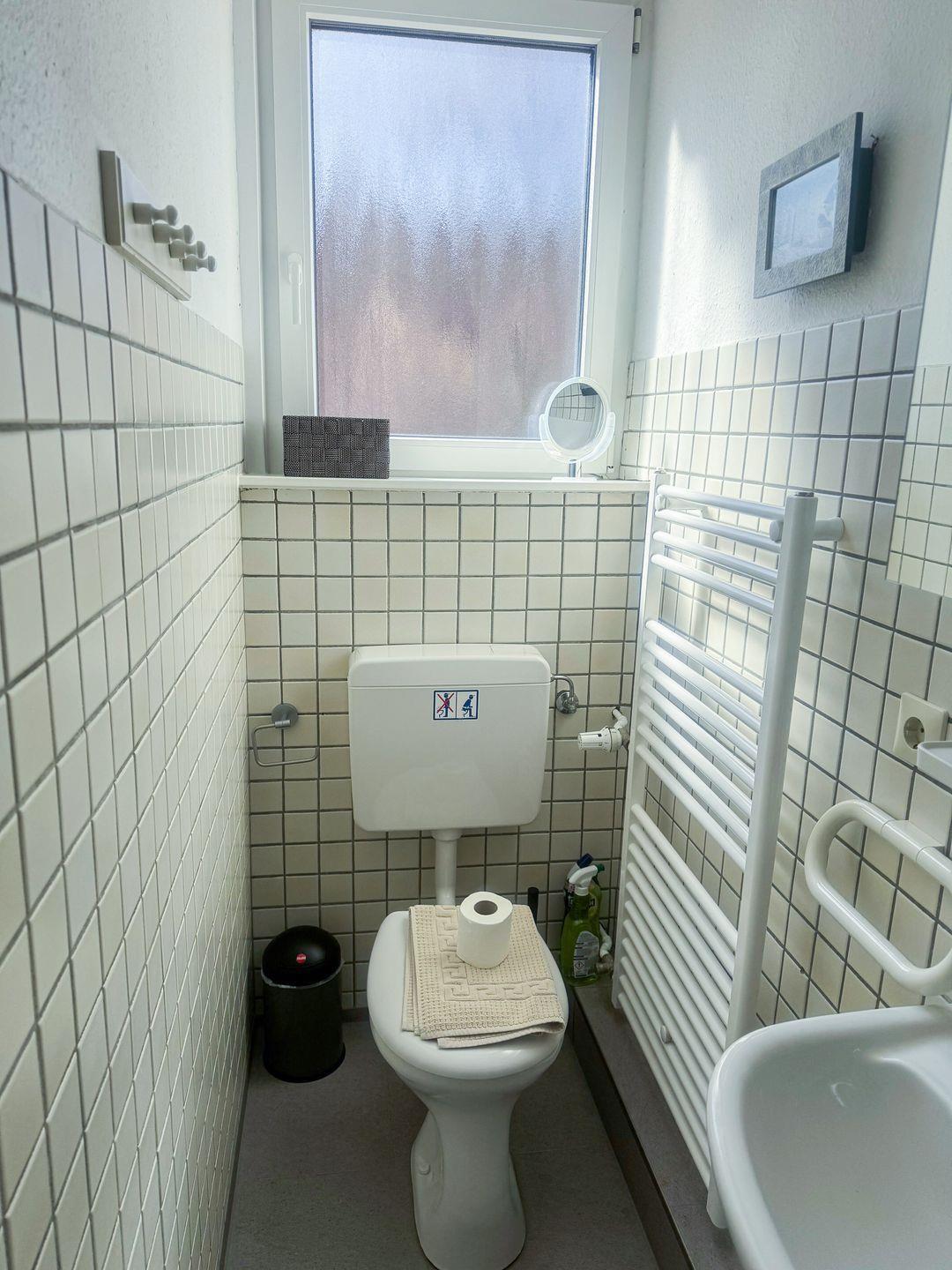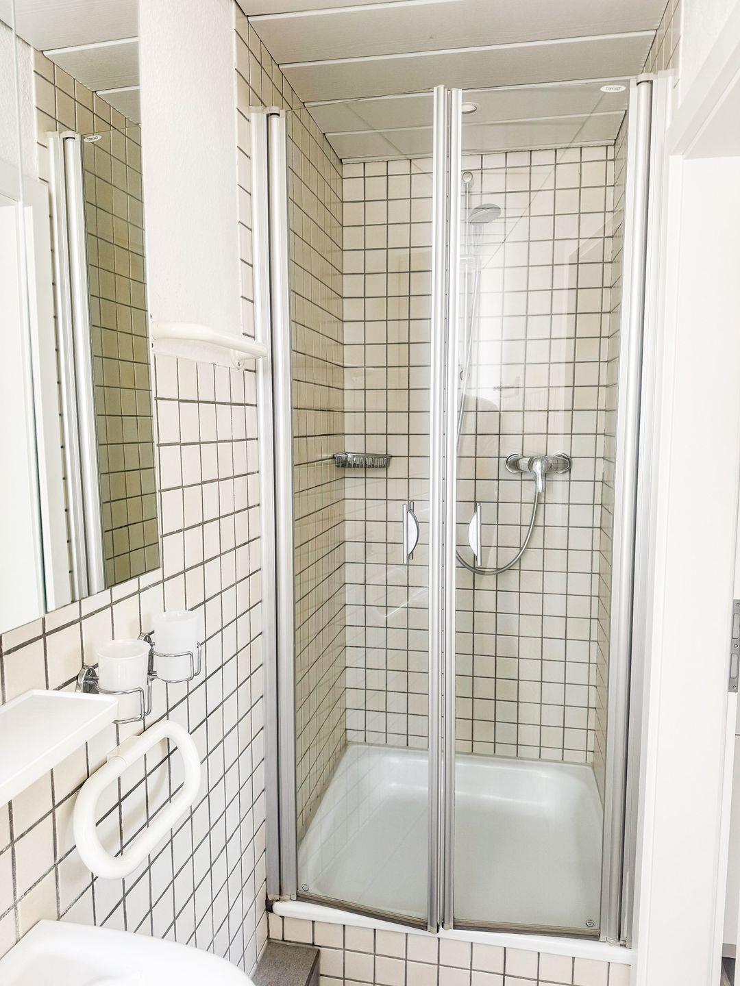 die Wohnung im 1. OG verfügt über ein separates Schlafzimmer mit Doppelbett, Diele, Wohn-Schlafraum (Schlafsofa 1,60m breit) mit Küchenzeile und Essecke sowie über ein Tageslichtbad mit Dusche/WC. Der wohnungseigene Parkplatz ist in Hausnähe im Kiefernweg. Im Haus befinden sich 2 Ferienwohnungen, Lebensmittelgeschäfte mit Bäcker in 350m Entfernung.