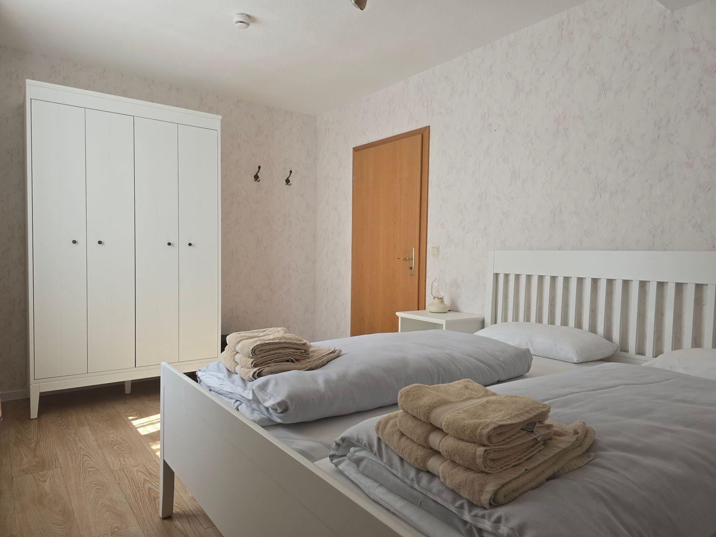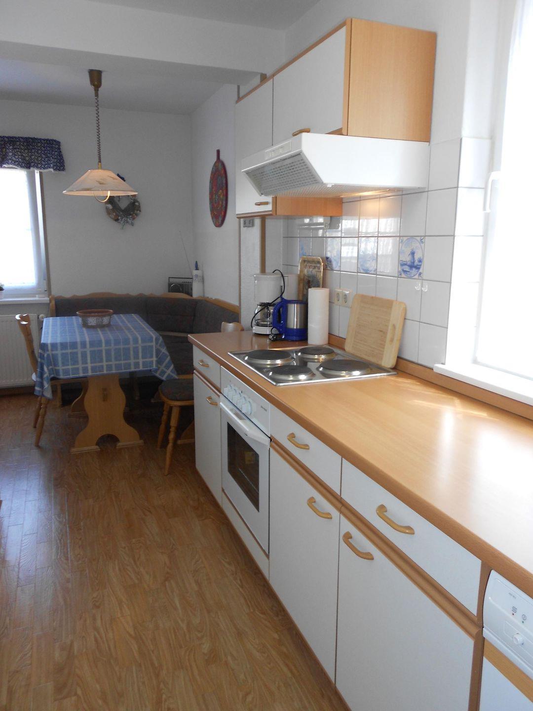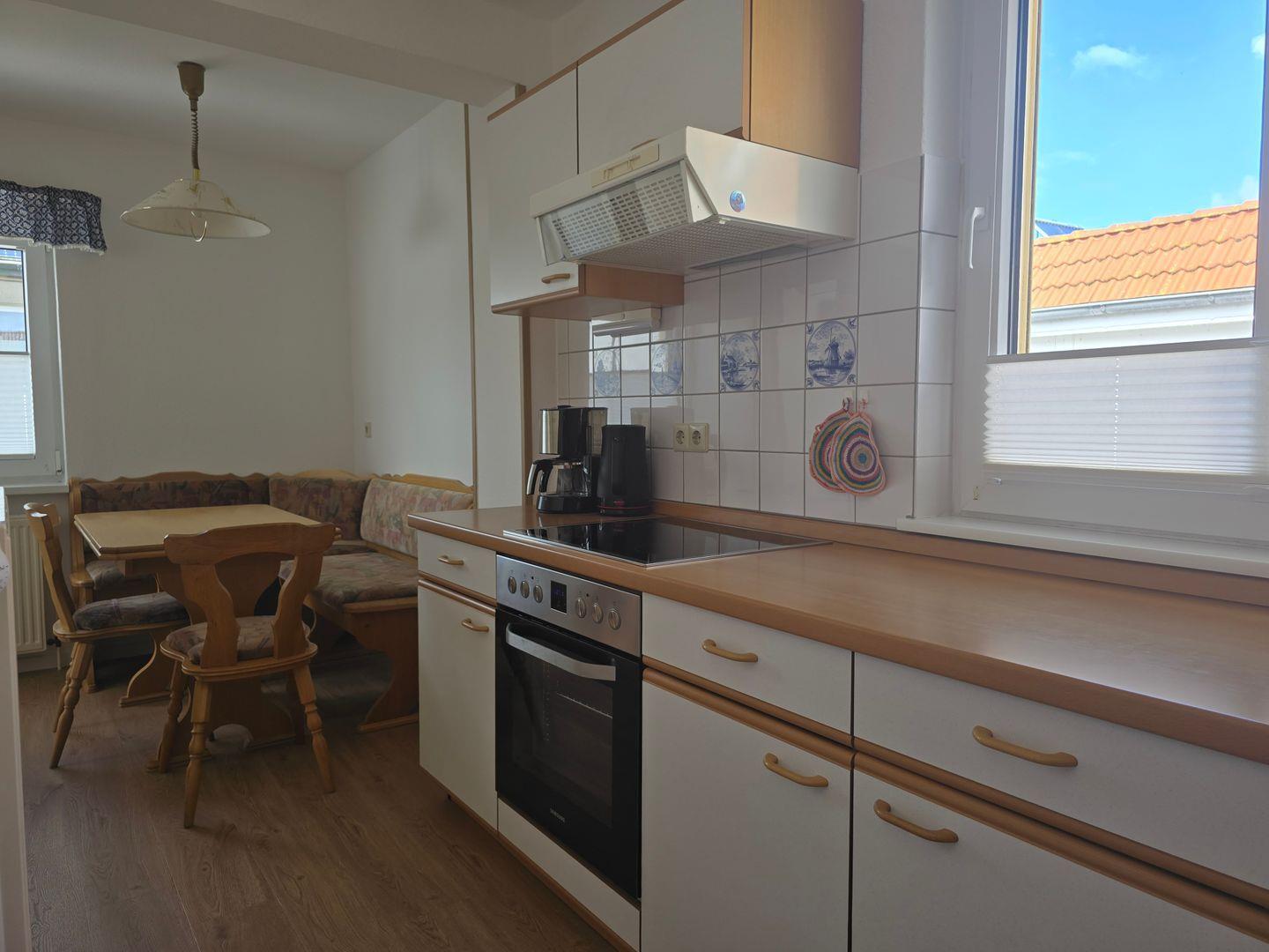 die Wohnung im 1. OG verfügt über ein separates Schlafzimmer mit Doppelbett und ein Wohnzimmer mit Schrankbett für 1 Person. Ein weiteres separates Schlafzimmer mit Einzelbett befindet sich hinter der separaten Küche mit Essplatz. Das Tageslichtbad hat Dusche/WC. Bäcker, Lebensmittelgeschäfte und die Strandpromenade sind die Straße rauf oder runter fußläufig zu erreichen.