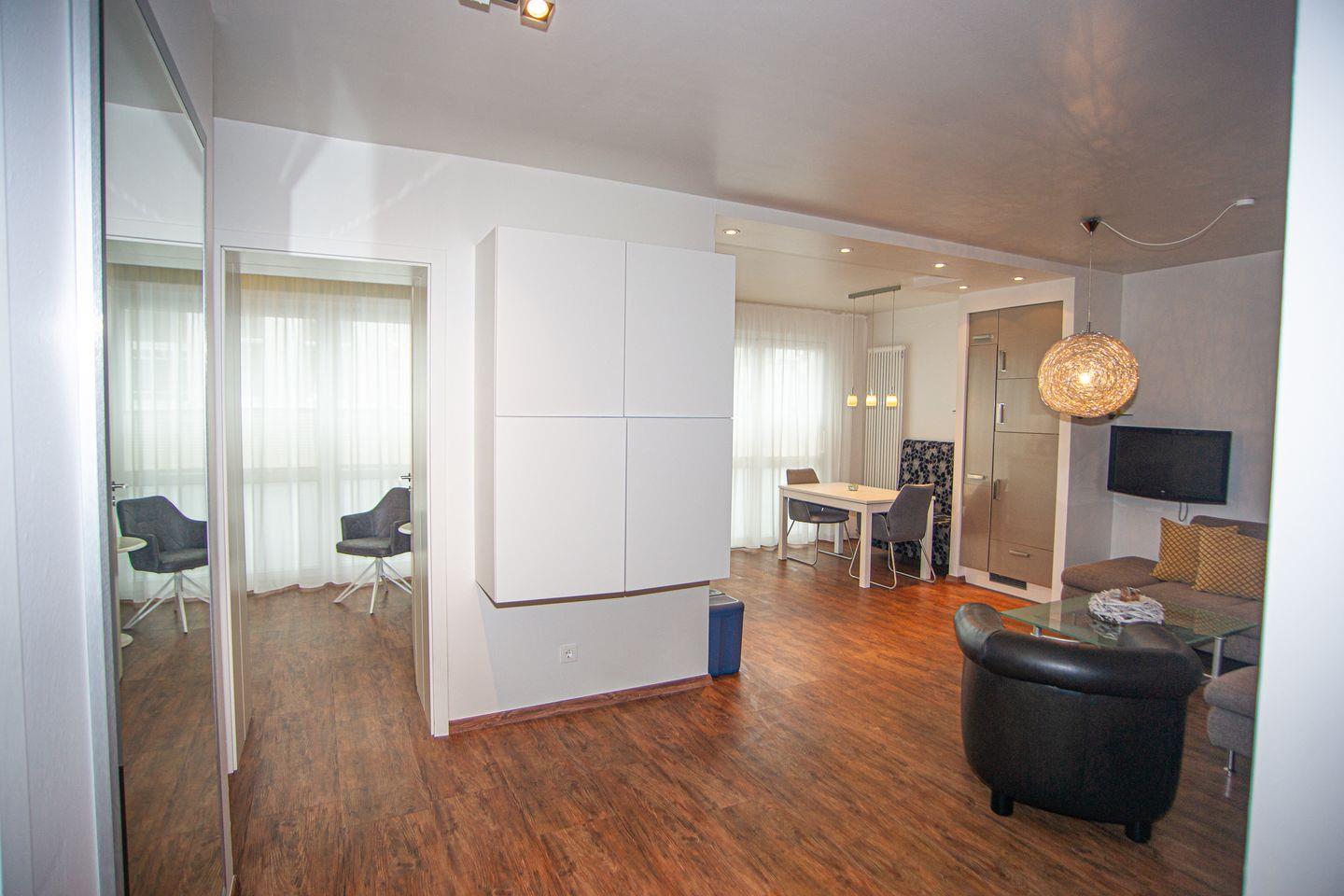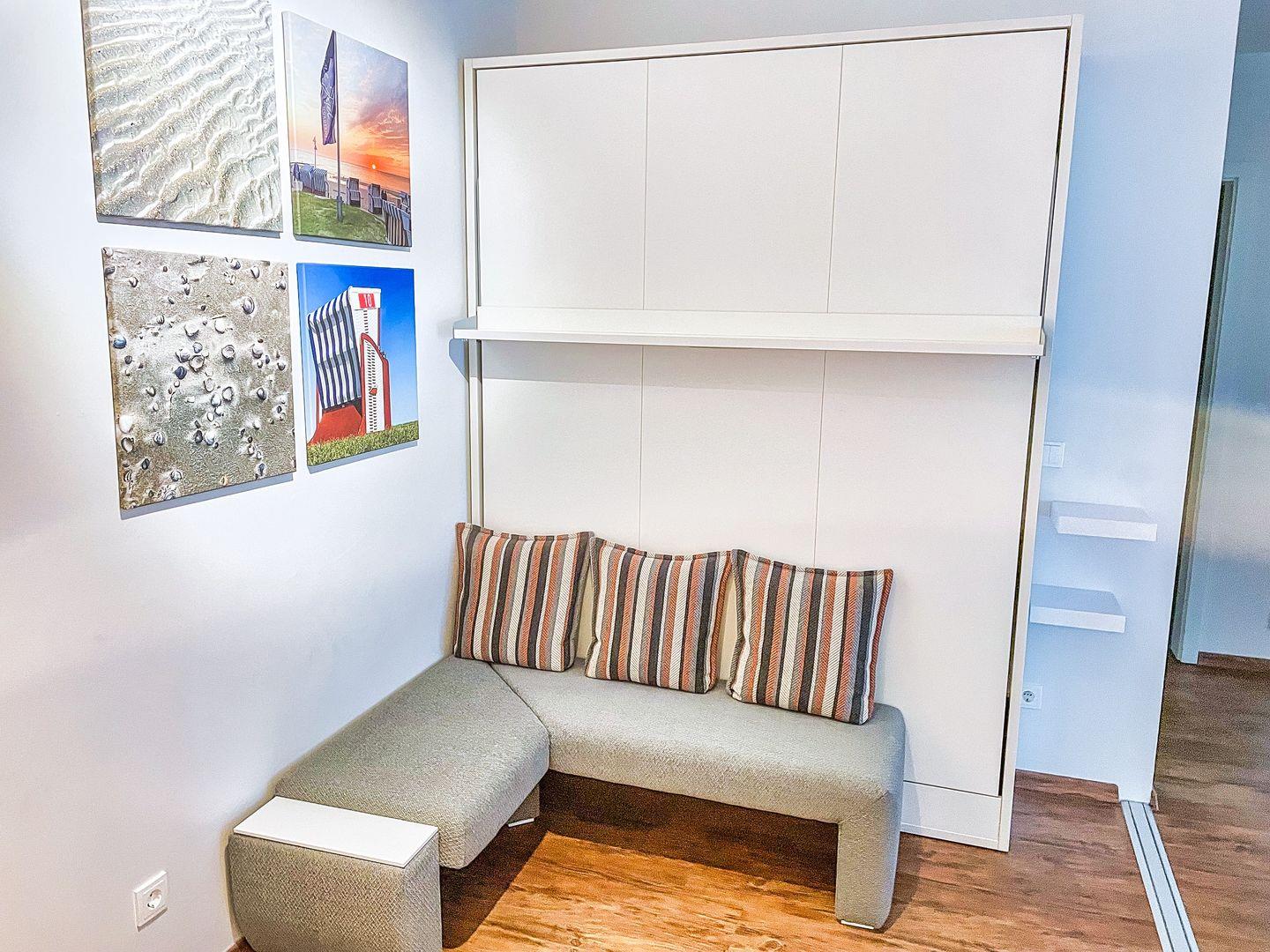 neben einem geräumigen Schlafzimmer mit Doppelbett und TV punktet die Wohnung mit einer zusätzlichen Schlafnische mit modernem Doppelschrankbett ( Breite: 1,60m ), das sich abends leicht mit einem Griff über das Sofa klappen lässt. Die Nische ist bei Bedarf durch eine Milchglas-Schiebetür vom Wohnzimmer abzutrennen. Im großzügigen Wohnraum mit vollausgestatteter Küchenzeile finden sowohl eine Sofalandschaft als auch eine Essecke vor der Fensterfront Platz. Das Badezimmer hat Dusche/WC.