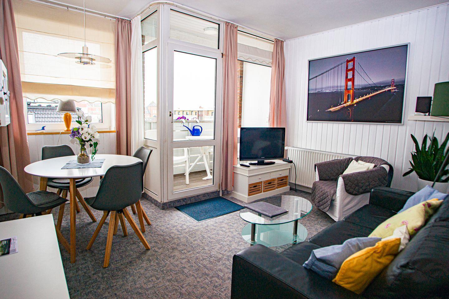 Moderne Ferienwohnung mit Balkon im Zentrum von Norderney, nahe Strand und zahlreichen Restaurants.