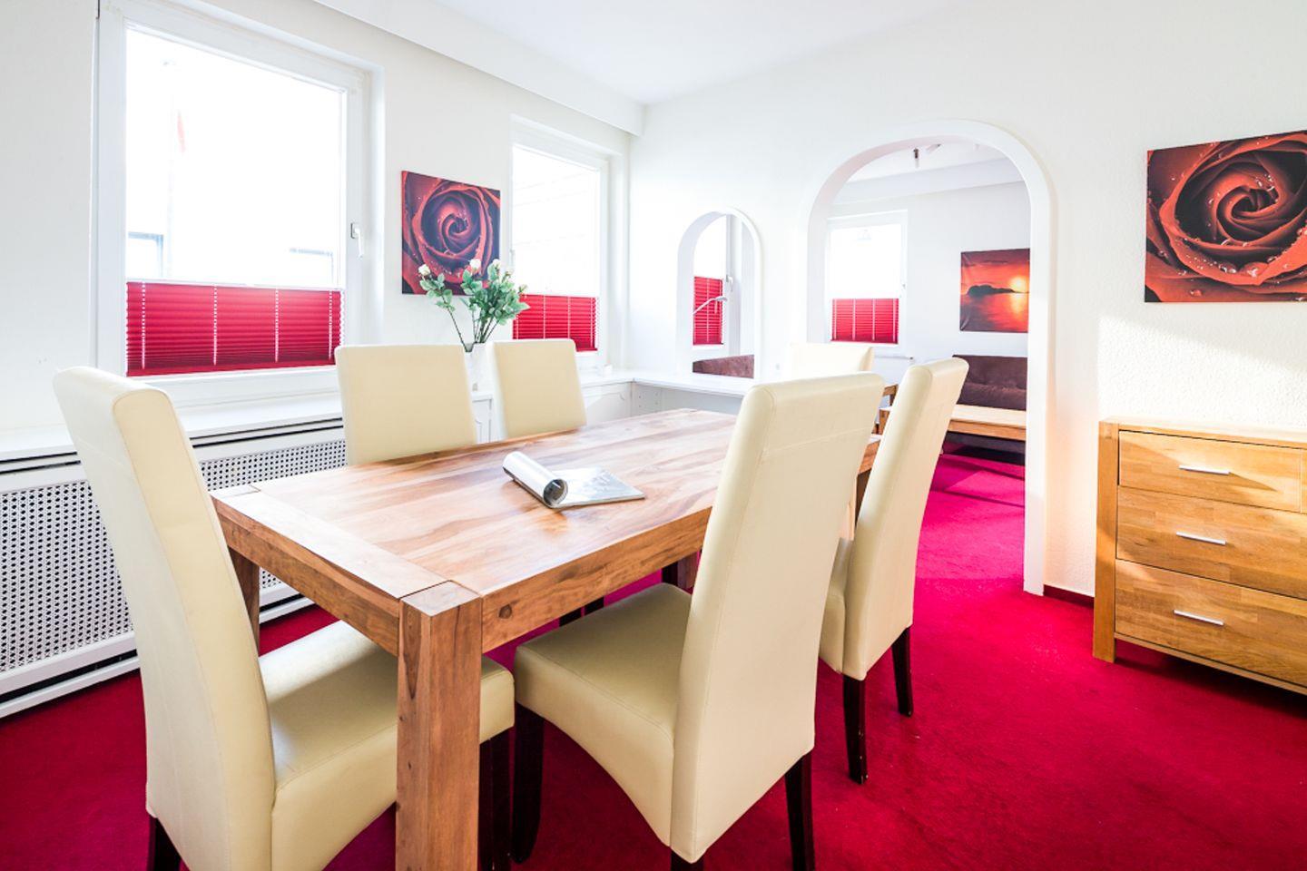 das geräumige Appartement im 1. OG verfügt über 2 separate Schlafzimmer: eines mit Doppelbett und zusätzlichem TV, das andere mit 2 Einzelbetten, die sich zusammenschieben lassen. Das Wohnzimmer ist durch einem offenen Durchgang mit dem Esszimmer verbunden. Die Küche ist separat mit einem Esstresen am Fenster für 2 Personen. Das Tageslichtbad hat Dusche/Waschbecken, das WC ist separat. Der kleine Balkon (15qm) Richtung Westen bietet Platz für 3-4 Personen.