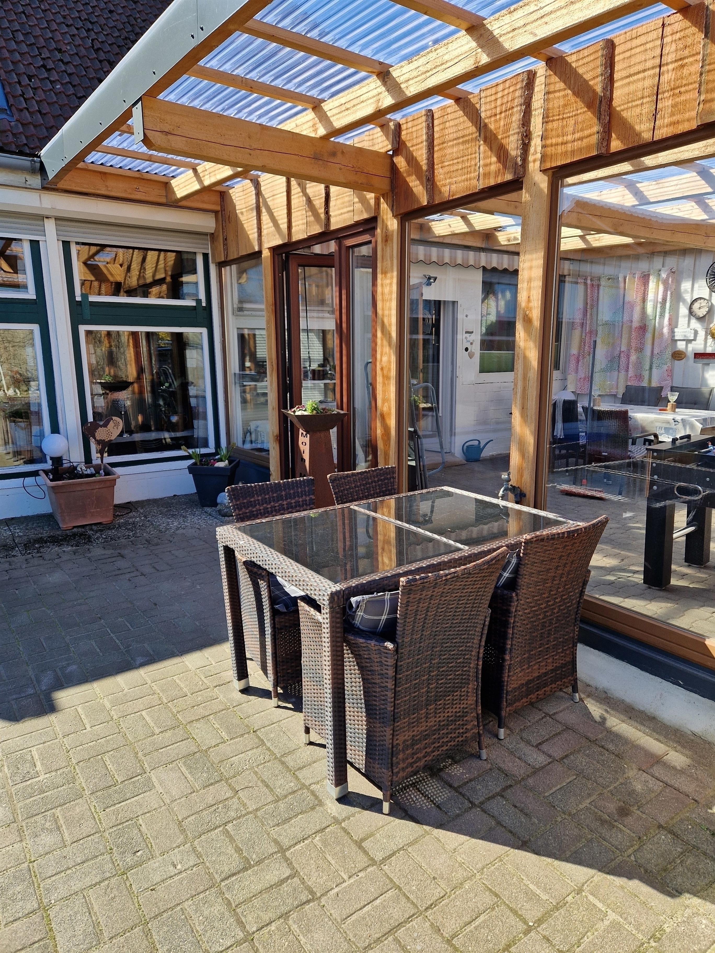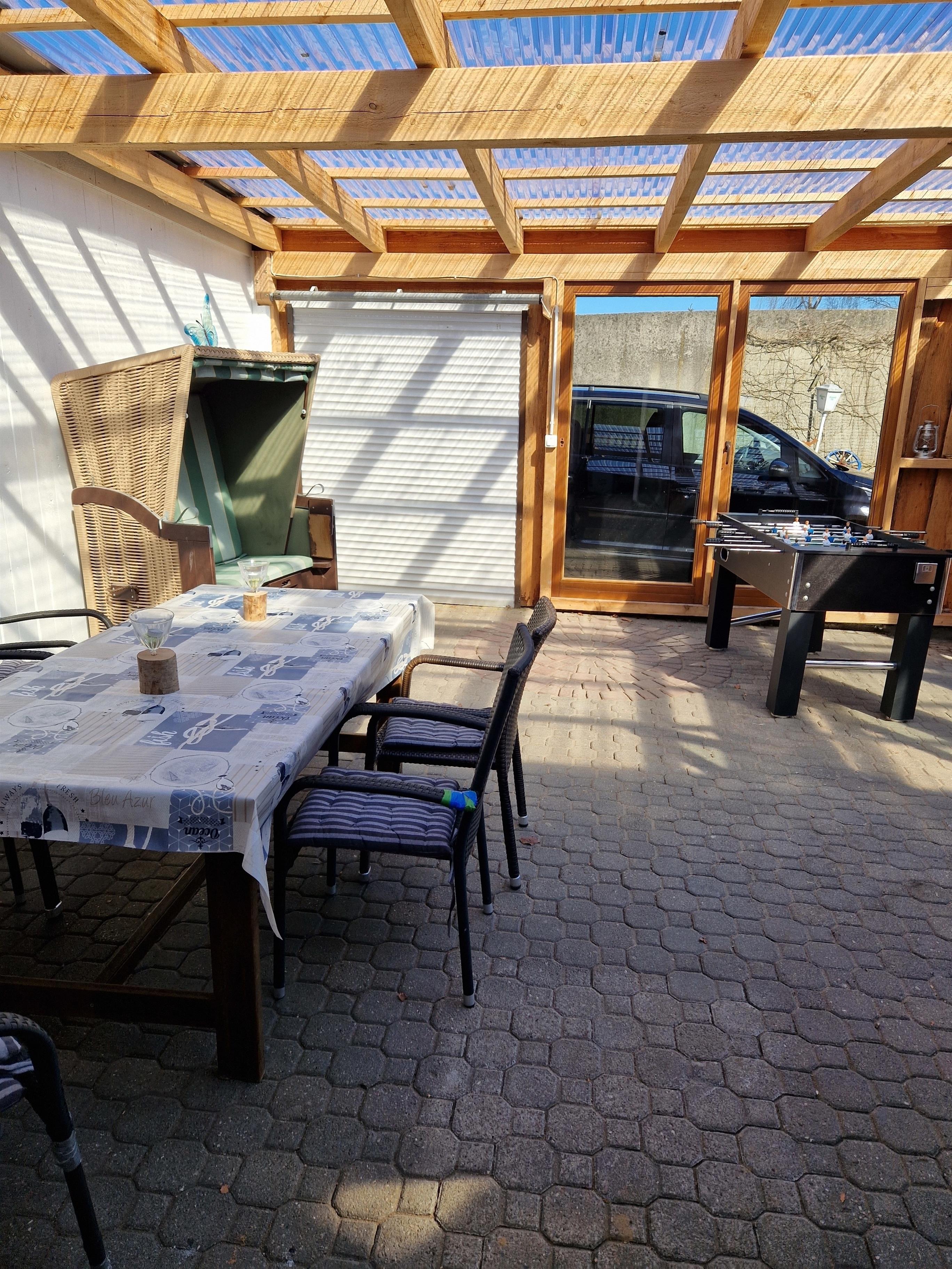 Vom rustikalen Wintergarten( der durch eine Jalousie zur Wohnung getrennt ist) geht aus geht es nach draußen. Dort lädt die überdachte Terrasse mit Tisch und Stühlen, Strandkorb und Grill, zum Verweilen ein. Sandkiste mit Spielzeug und einige Fahrzeuge stehen für die kleinen Gäste bereit