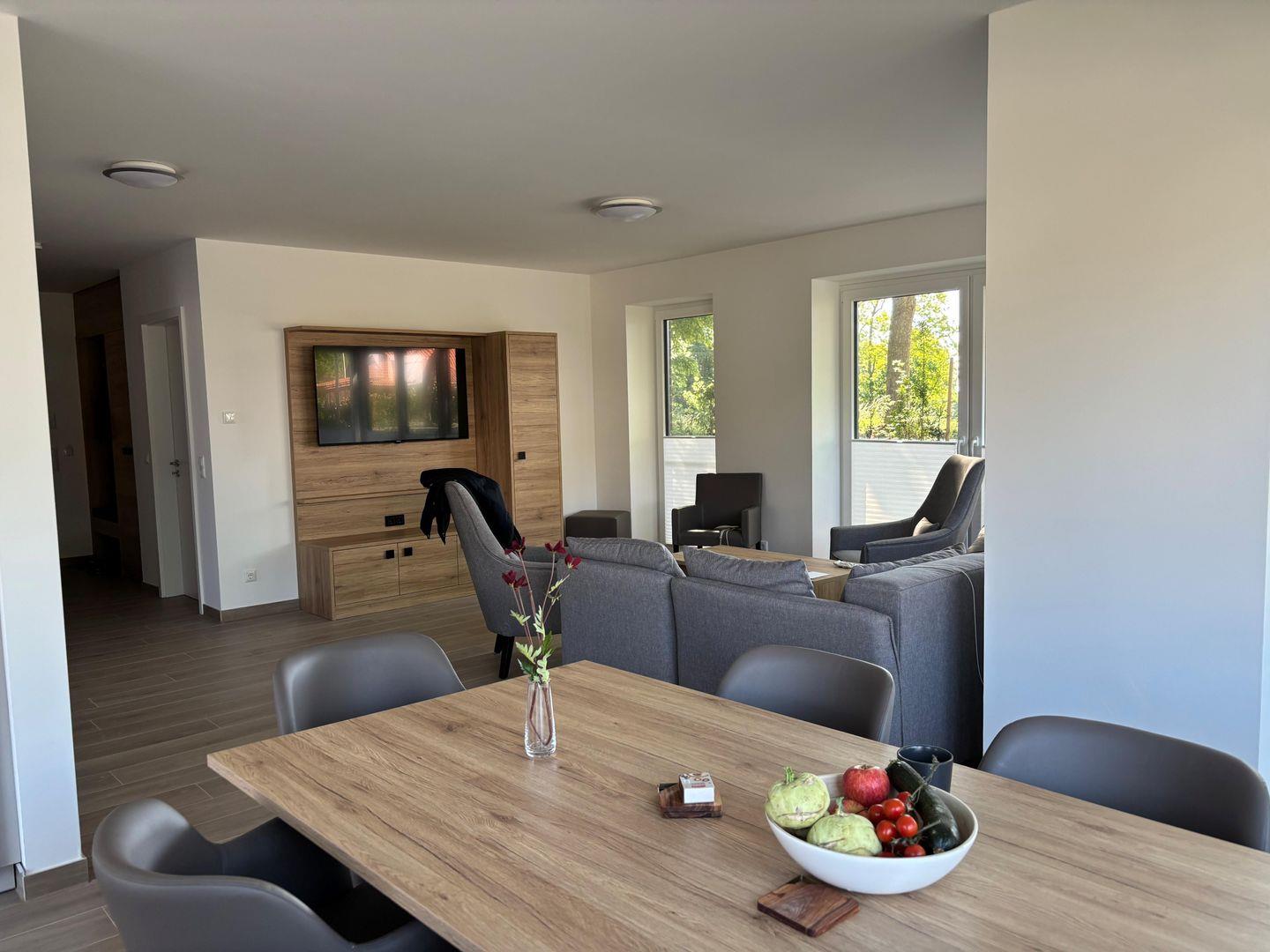 Die offen zum Wohnzimmer gestaltete Küche ist modern ausgestattet und ermöglicht gemeinsames Kochen und Genießen. Sie finden hier einen Ceranherd, Backofen, Kühlschrank mit Gefrierfach, Spülmaschine, Mikrowelle, Wasserkocher, Toaster sowie eine Kaffeemaschine und sämtliche Küchenutensilien, Geschirr und Besteck. Der angrenzende Essbereich mit Esstisch lädt zu geselligen Mahlzeiten ein, während in der Sofaecke mit bequemer Sitzgelegenheit mit Fernseher für abwechslungsreiche Unterhaltung sorgen. Die gesamte Wohnung ist mit Fliesenböden ausgestattet, was nicht nur für einen eleganten Stil, sondern auch für angenehme Fußbodenheizung sorgt.