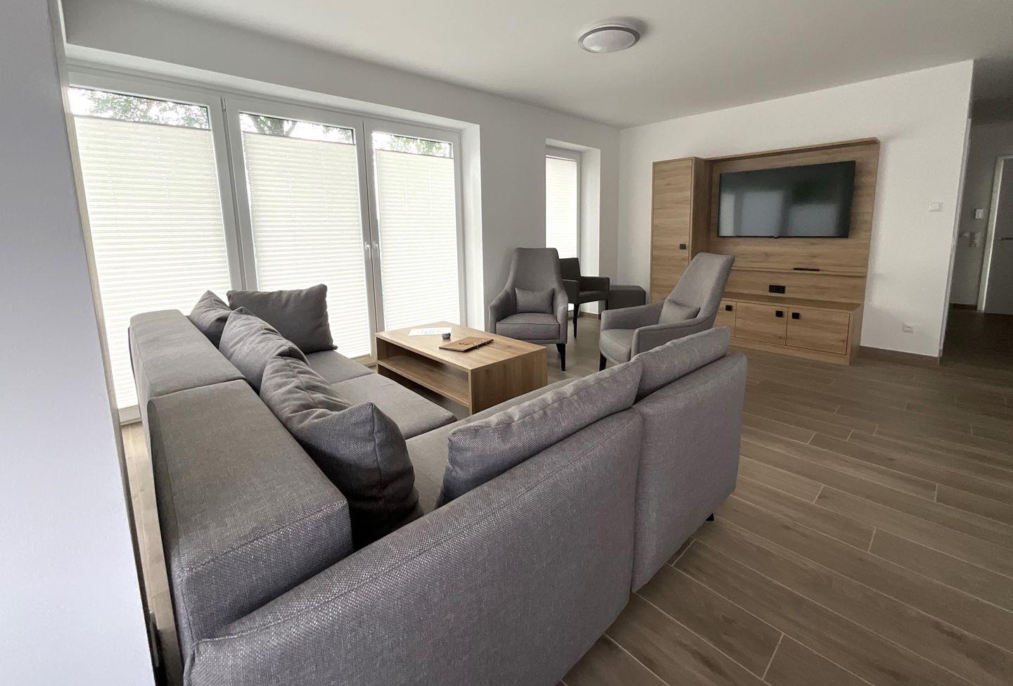 Wohnzimmer: gemütliche Sitzecke mit Sessel, Sofa, Flachbildfernseher, Empfang deutschsprachiger TV-Programme