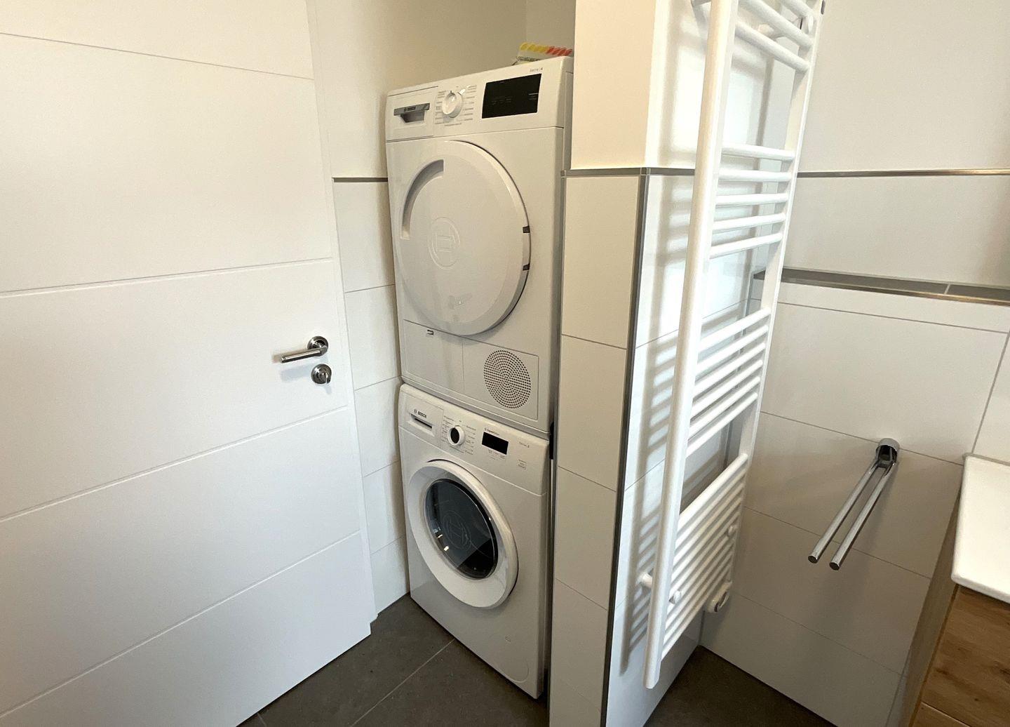 Das hochwertige Badezimmer ist mit eigener Sauna, bodengleicher Dusche, WC, Waschbecken, Spiegel, Fenster, Haartrockner und allen notwendigen Annehmlichkeiten eingerichtet. Eine Waschmaschine und ein Trockner stehen zur Eigennutzung bereit.