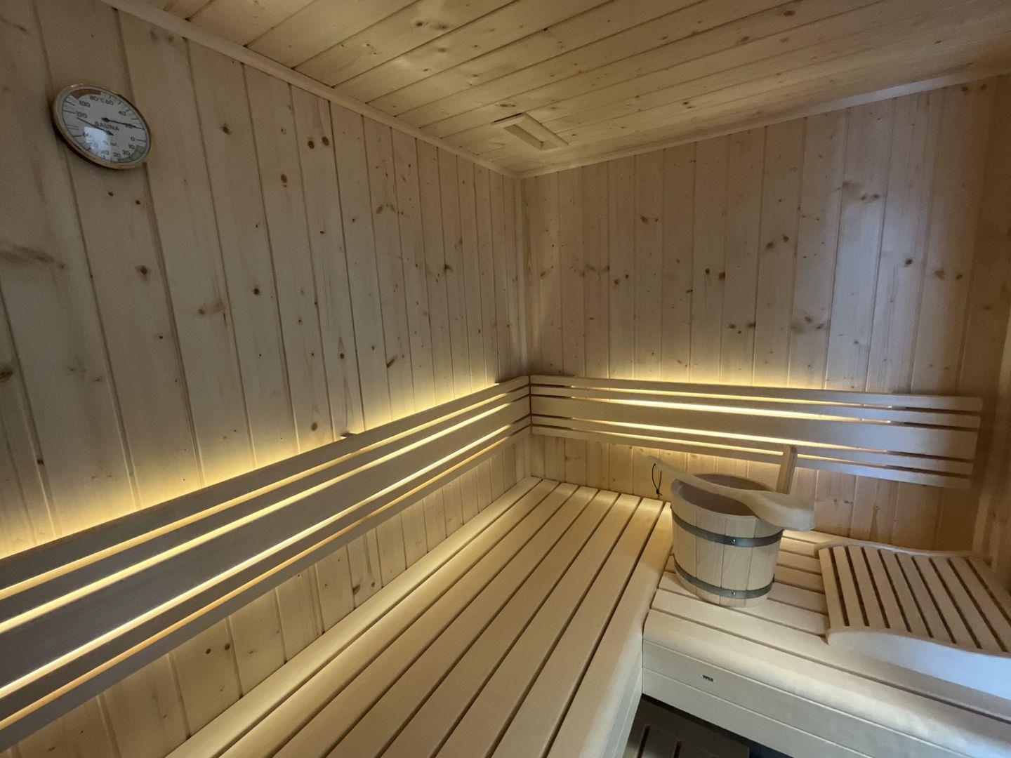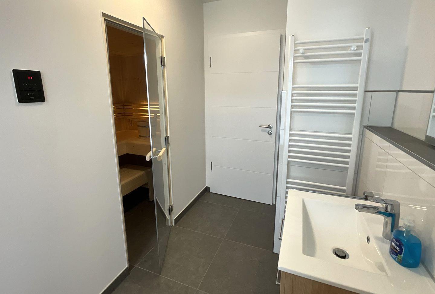 Das hochwertige Badezimmer ist mit eigener Sauna, bodengleicher Dusche, WC, Waschbecken, Spiegel, Fenster, Haartrockner und allen notwendigen Annehmlichkeiten eingerichtet. Eine Waschmaschine und ein Trockner stehen zur Eigennutzung bereit.
