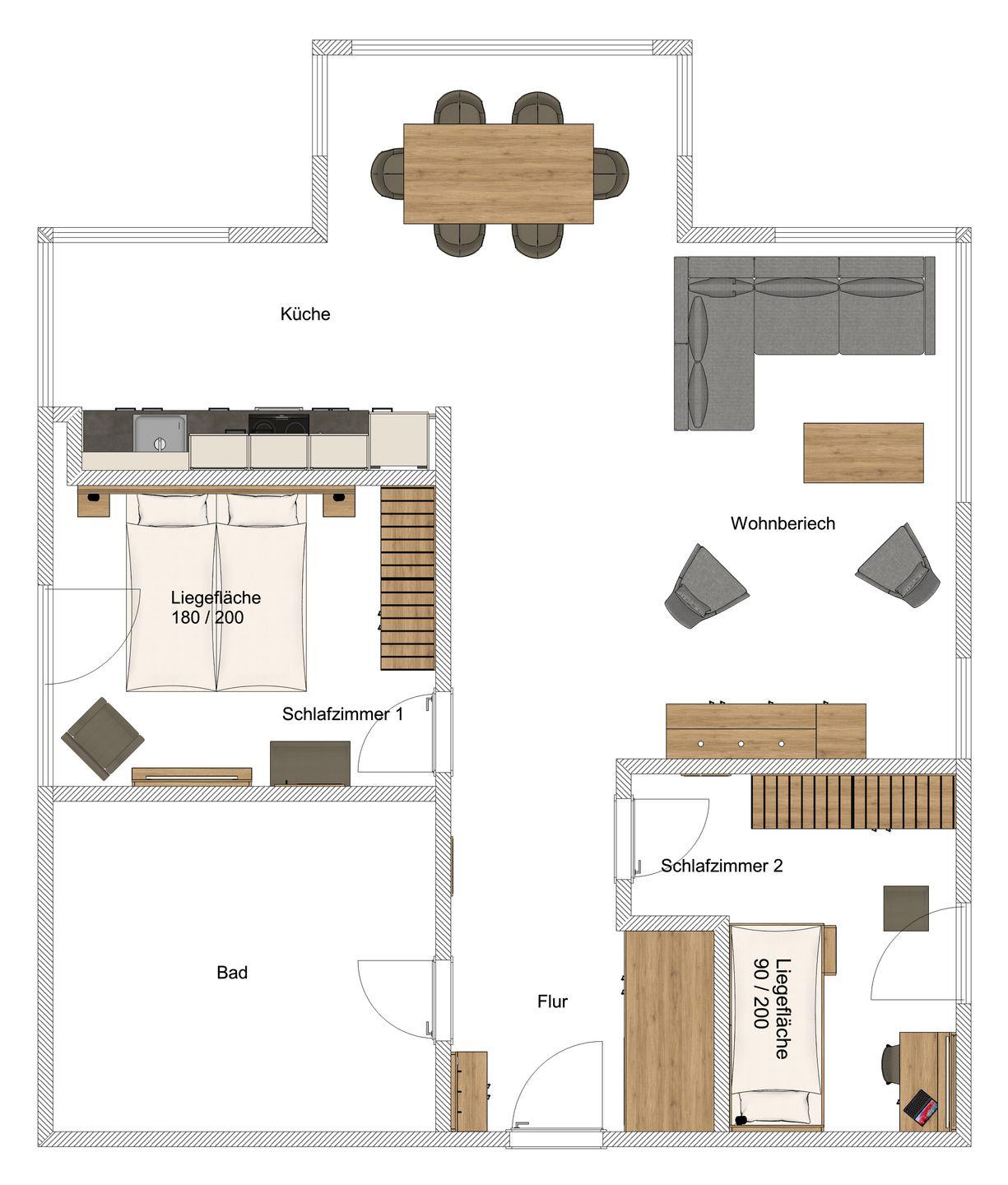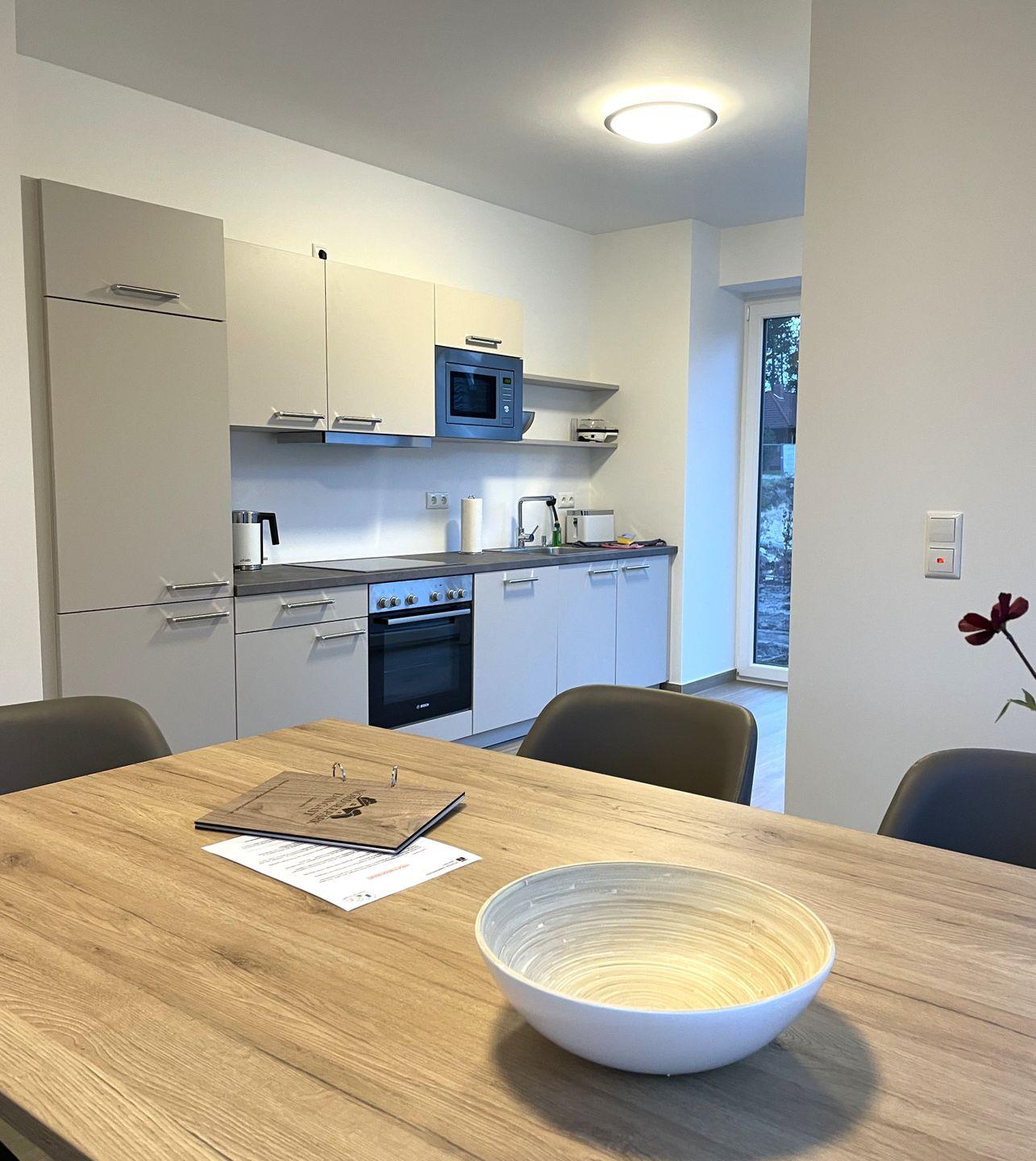 Die offen zum Wohnzimmer gestaltete Küche ist modern ausgestattet und ermöglicht gemeinsames Kochen und Genießen. Sie finden hier einen Ceranherd, Backofen, Kühlschrank mit Gefrierfach, Spülmaschine, Mikrowelle, Wasserkocher, Toaster sowie eine Kaffeemaschine und sämtliche Küchenutensilien, Geschirr und Besteck. Der angrenzende Essbereich mit Esstisch lädt zu geselligen Mahlzeiten ein, während in der Sofaecke mit bequemer Sitzgelegenheit mit Fernseher für abwechslungsreiche Unterhaltung sorgen. Die gesamte Wohnung ist mit Fliesenböden ausgestattet, was nicht nur für einen eleganten Stil, sondern auch für angenehme Fußbodenheizung sorgt.