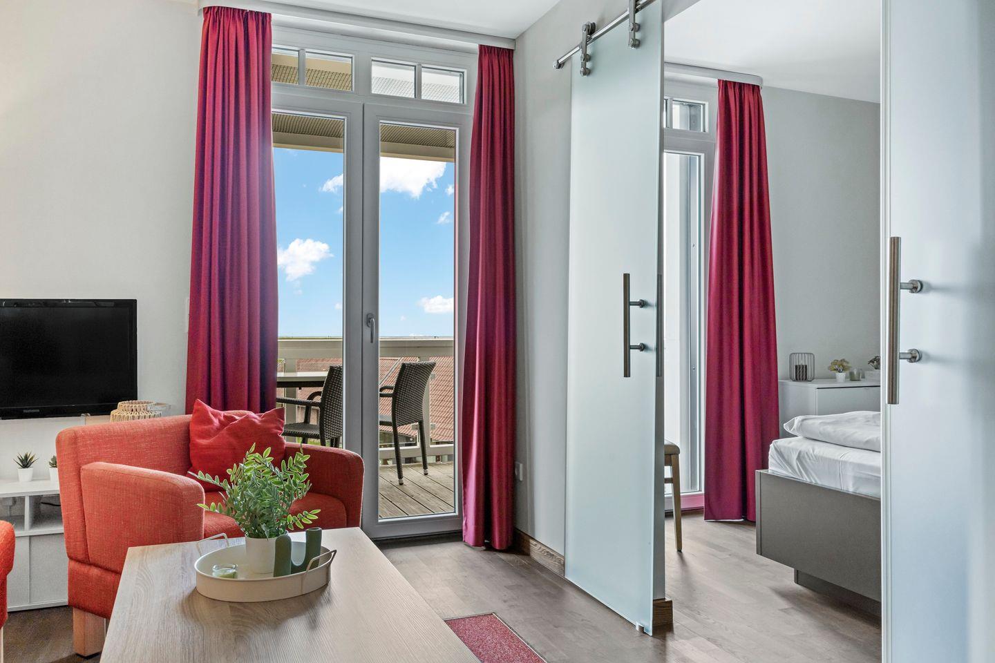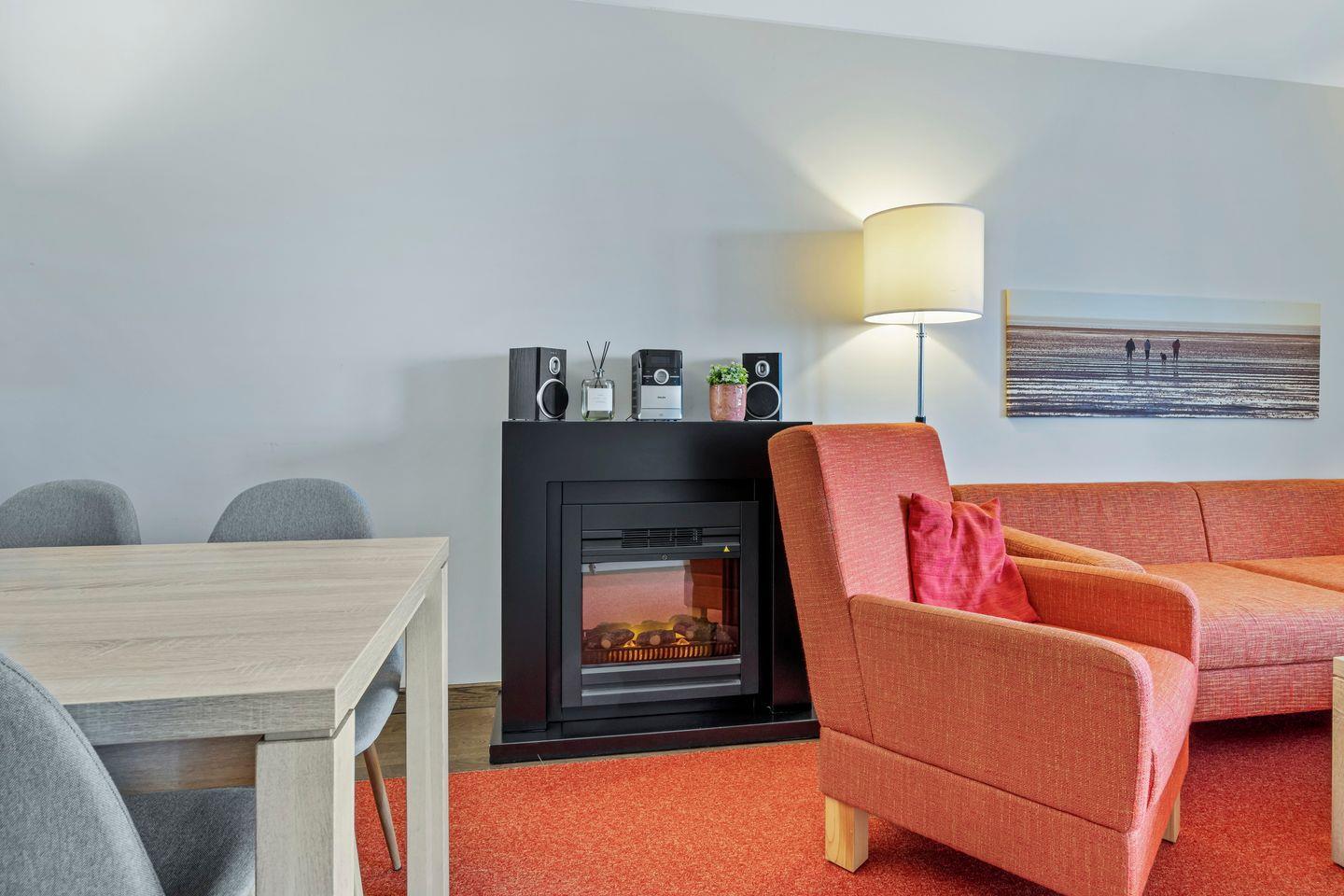 Das moderne Nichtraucher-Apartment mit kostenfreiem WLAN verfügt über eine voll ausgestattete offene Küche mit Geschirrspüler, Kaffeemaschine, Toaster, Wasserkocher, Tiefkühlfach und Backofen. Im Schlafzimmer steht euch ein Doppelbett (1,80 x 2,00 m), im Wohnbereich ein Flatscreen-TV, eine HiFi-Anlage, ein Bluetooth-Lautsprecher von Marshall und ein Elektrokamin zur Verfügung. Im komfortablen Badezimmer mit begehbarer Dusche, WC, Bidet, Föhn und Kosmetikspiegel befindet sich eine eigene Sauna zur vollkommenen Entspannung in privater Atmosphäre. Das Apartment verfügt außerdem über einen sonnigen Balkon mit Gartenmöbeln für zwei Personen, der sowohl vom Wohn- als auch vom Schlafzimmer zugänglich ist.