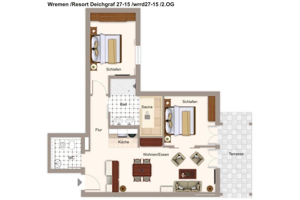 Moderne Ferienwohnung in Nordseebad Wremen mit Sauna, Balkon und Meerblick, nur 350 m vom Strand entfernt.