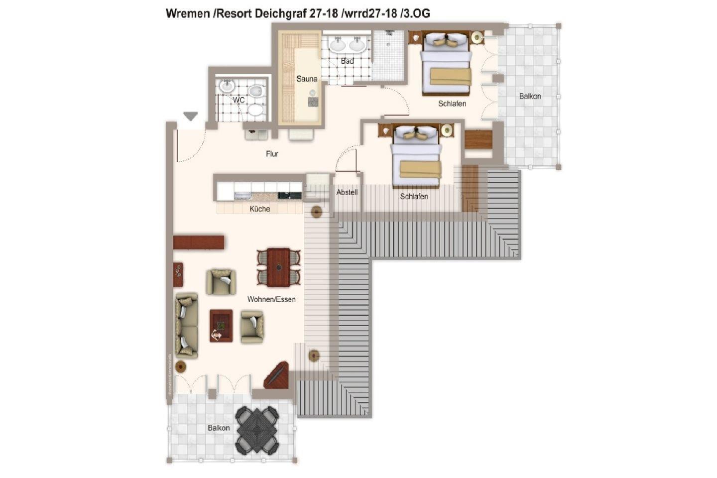 Das 92 m² große 3-Zimmer Penthaus ist für bis zu 4 Personen geeignet. Besonders hervorzuheben sind die Sauna im Apartment und die zwei großzügigen Balkone mit seitlichem Meerblick bzw. mit Blick Richtung Bremerhaven und Überseehafen.
