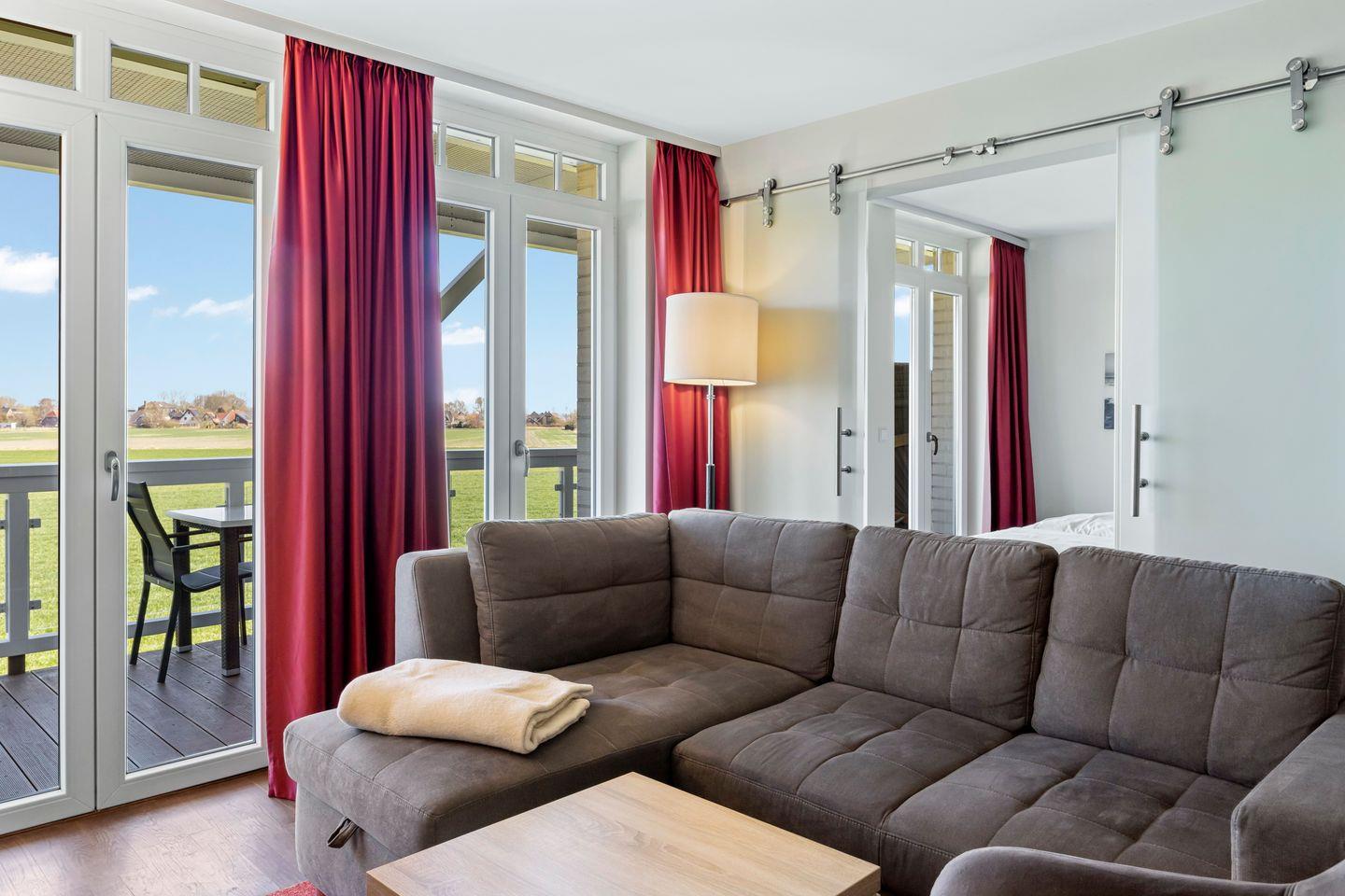 Die 73 m² große 3-Zimmer Ferienwohnung ist für bis zu 4 Personen geeignet. Besonders hervorzuheben sind die Sauna des Apartments und der großzügige Balkon mit Strandkorb und einem wundervollen Landblick in das idyllische Umland.