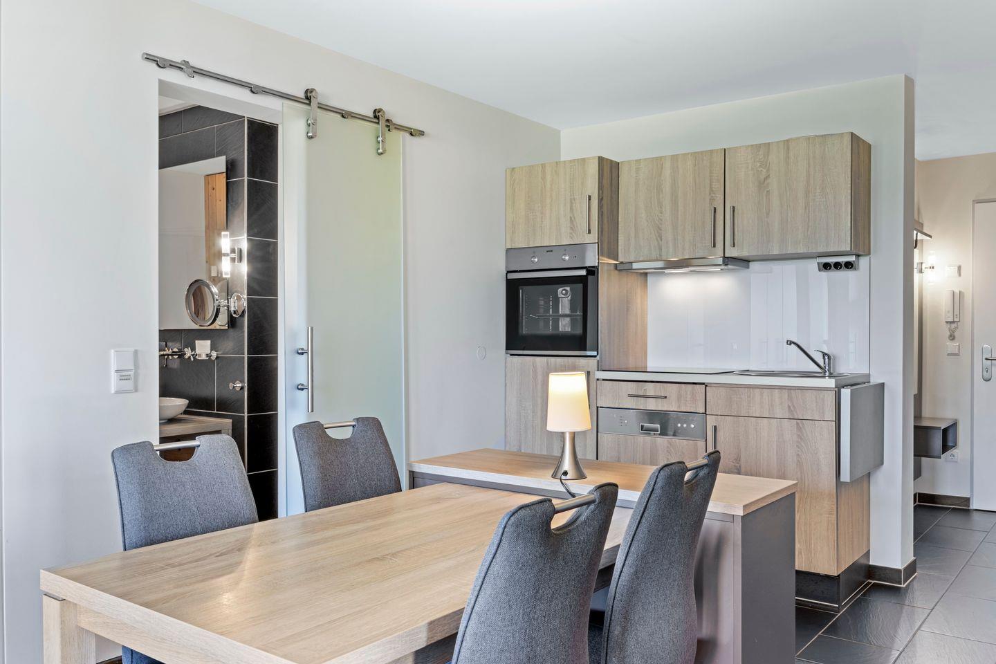 Das moderne Nichtraucher-Apartment verfügt über kostenfreies WLAN und eine voll ausgestattete offene Küche mit Geschirrspüler, Kaffeemaschine, Toaster, Wasserkocher, Tiefkühlfach, Mikrowelle und Backofen. In den beiden Schlafzimmern stehen euch jeweils ein Doppelbett (1,80 x 2,00 m), im Wohn-Essbereich ein Flatscreen-TV mit Blu-ray-Player, eine HiFi-Anlage, Gesellschaftsspiele und ein Elektrokamin zur Verfügung. Ein Kinderbett kann gegen Entgelt aufgestellt werden und auf Wunsch könnt ihr einen Hochstuhl hinzubuchen.