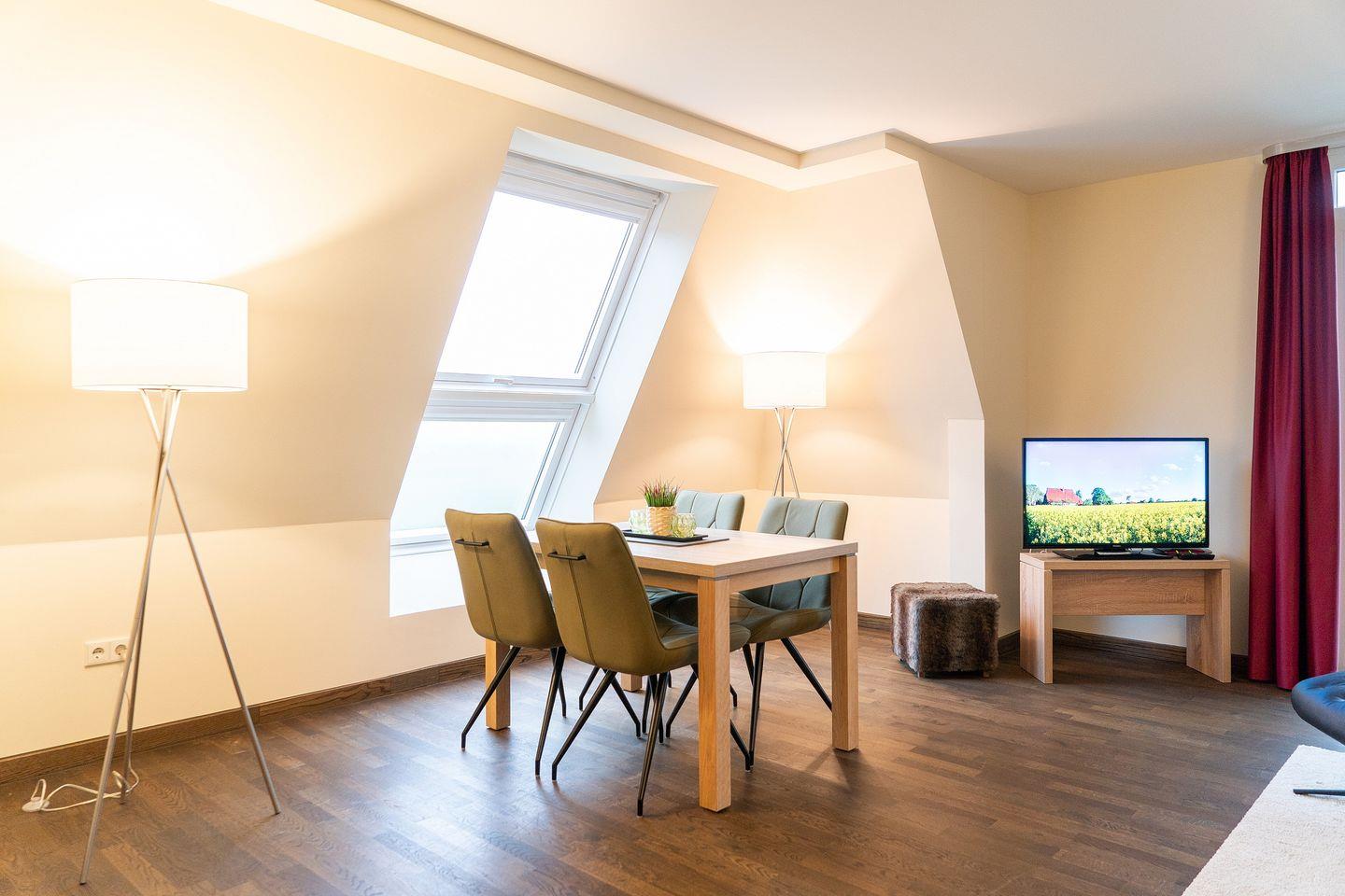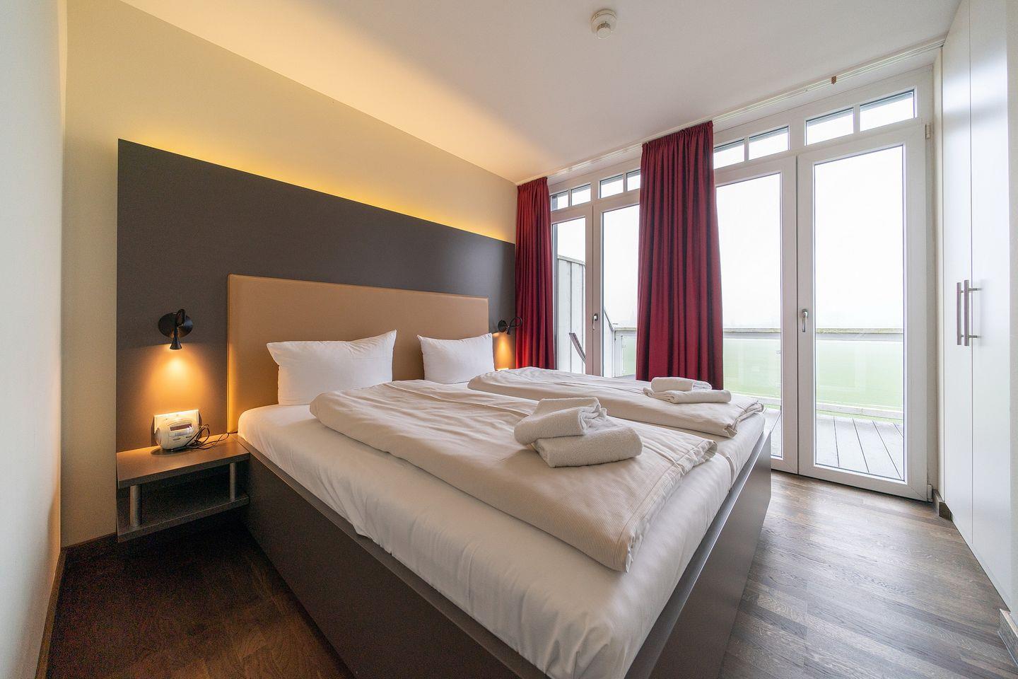 Das 92 m² große 3-Zimmer Penthaus-Apartment ist für bis zu 4 Personen geeignet. Besonders hervorzuheben sind hier die einmalige Lage, die private Sauna und die zwei großzügigen Balkone mit Meerblick zum Deich und der Nordsee bzw. Landblick über die Weiden und Felder.