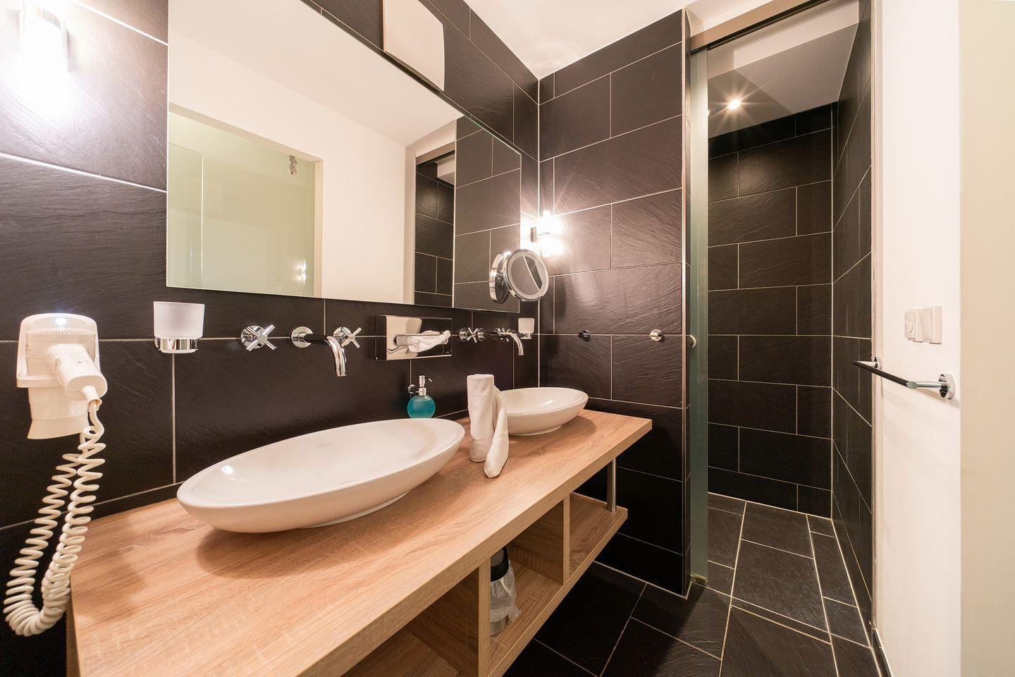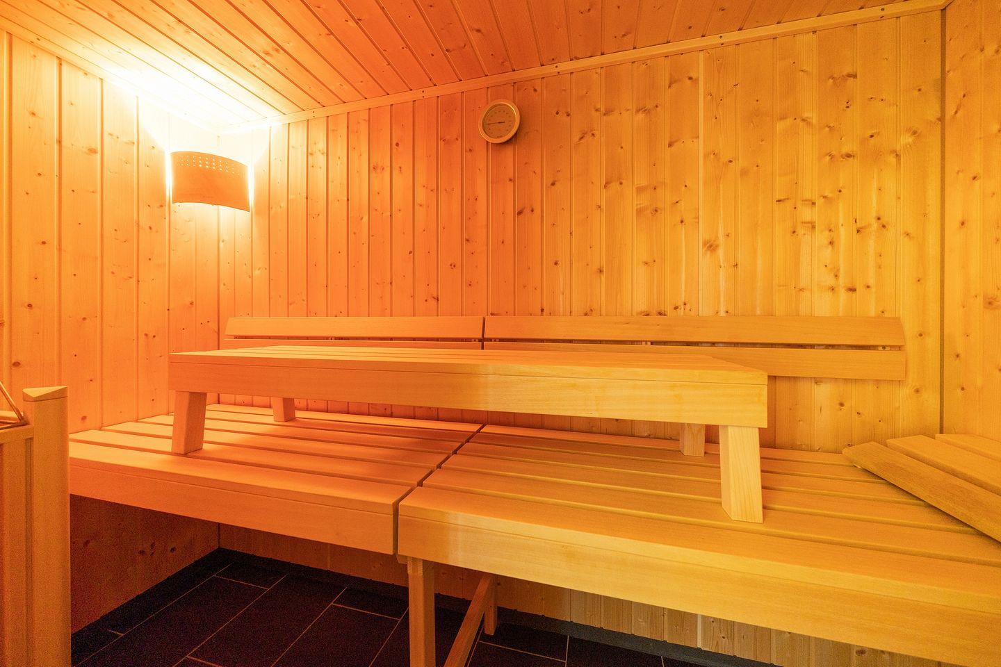 Im komfortablen Badezimmer mit begehbarer Regendusche, Doppelwaschtisch, Föhn und Kosmetikspiegel befindet sich eine eigene Sauna zur vollkommenen Entspannung in privater Atmosphäre. Das separate WC beinhaltet ein Bidet und Waschbecken.