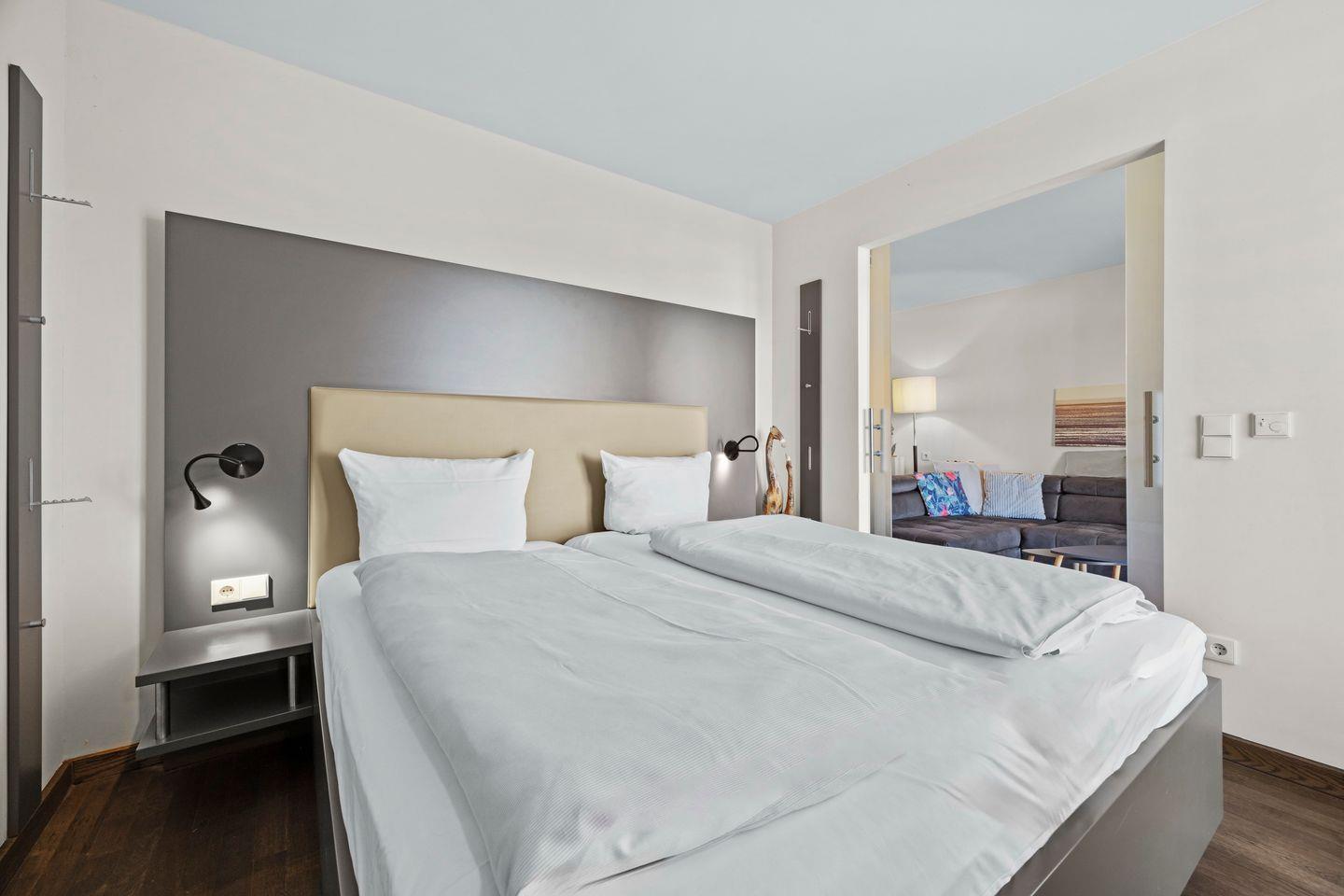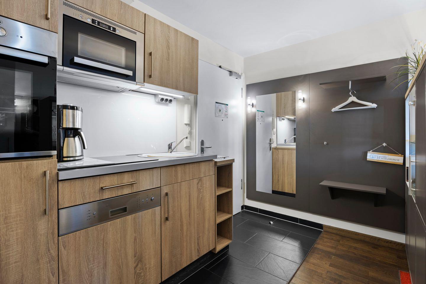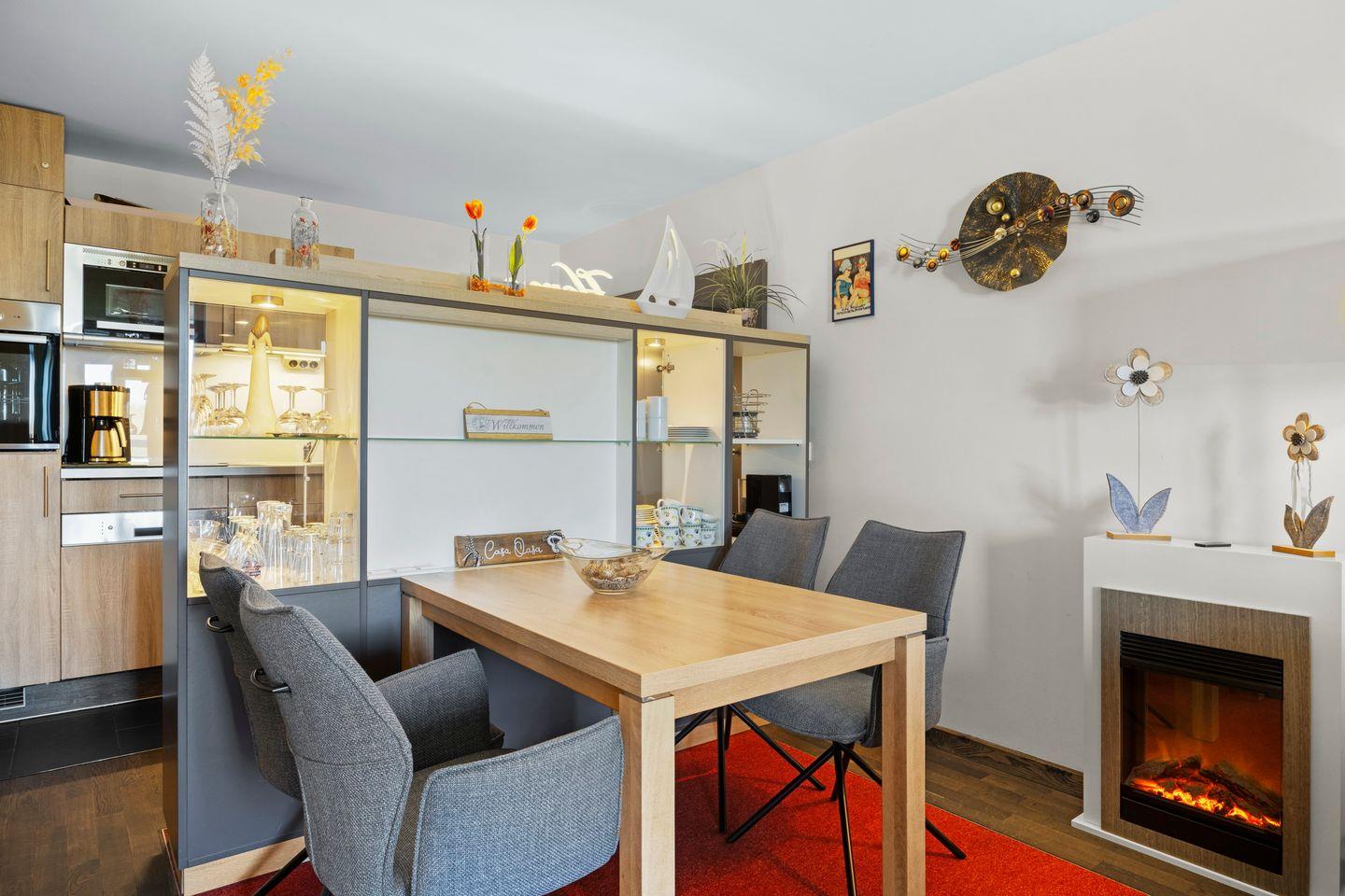 Das moderne und mit viel Liebe zum Detail eingerichtete Nichtraucher-Apartment verfügt über kostenfreies WLAN und eine voll ausgestattete offene Küche mit Geschirrspüler, Mikrowelle, Kaffeefilter- und Kaffeekapselmaschine (Nespresso), Toaster, Eierkocher, Wasserkocher und Backofen. Im Schlafzimmer stehen euch ein Doppelbett (1,80 x 2,00 m) und ein Flatscreen-TV zur Verfügung. Im Wohn-Essbereich befindet sich ein weiterer Flatscreen-TV, eine HiFi-Anlage, ein Elektrokamin und eine Schlafcouch (1,40 x 2,10 m). Ein Kinderbett kann gegen Entgelt aufgestellt werden und auf Wunsch könnt ihr einen Hochstuhl hinzubuchen.