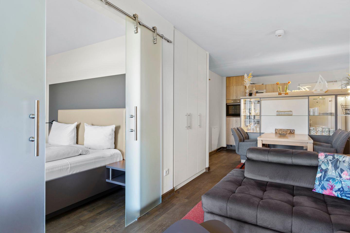 Die 53 m² große 2-Zimmer Ferienwohnung ist für bis zu 3 Personen geeignet. Besonders hervorzuheben ist die Sauna des Apartments und der großzügige überdachte Balkon mit XXL-Strandkorb.