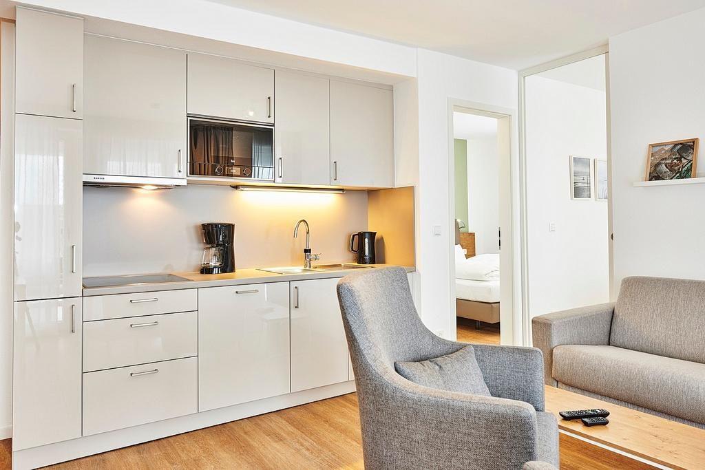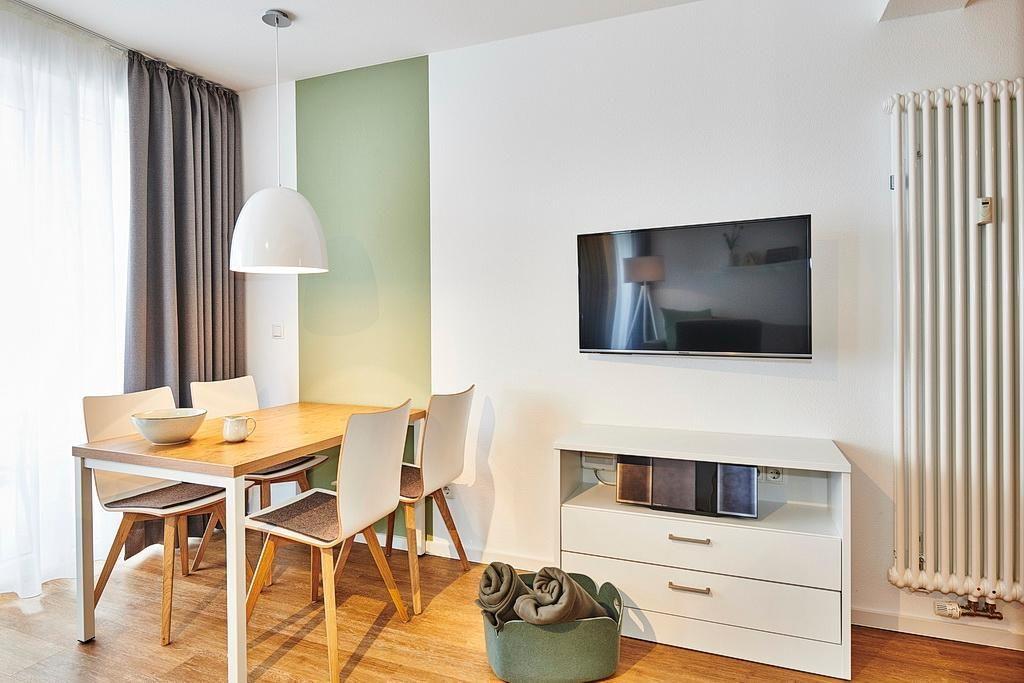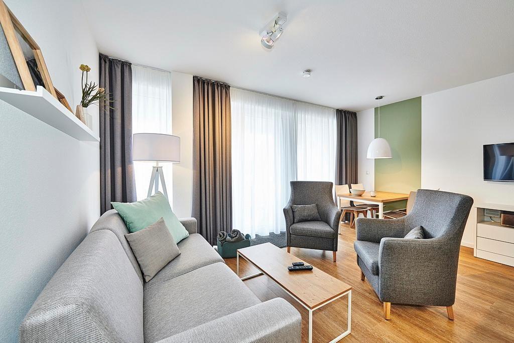 Das geschmackvoll eingerichtete Nichtraucher-Apartment verfügt über kostenfreies WLAN. Der Wohnbereich bietet eine voll ausgestattete offene Küchenzeile mit Geschirrspüler, Gefrierfach, Kaffeemaschine, Toaster, Wasserkocher und Mikrowelle mit Backfunktion sowie einen großen Flatscreen-TV und ein Radio. Das Apartment verfügt über einen Esstisch für 5 Personen und einen behaglichen Sitzbereich. Zwei separate Schlafzimmer mit jeweils einem Doppelbett stehen euch zur Verfügung. Eines davon verfügt zudem über einen eigenen Flatscreen-TV. Ein Kinderbett kann gegen Entgelt aufgestellt werden. Im stilvollen Badezimmer befinden sich eine große begehbare Dusche sowie ein Waschtisch mit Föhn und Kosmetikspiegel. Nach einem erlebnisreichen Urlaubstag entspannt ihr auf dem überdachten und mit Gartenmöbeln für 5 Personen ausgestatteten Balkon. Der Balkon ist vom Wohnbereich und vom Hauptschlafzimmer aus zugänglich.