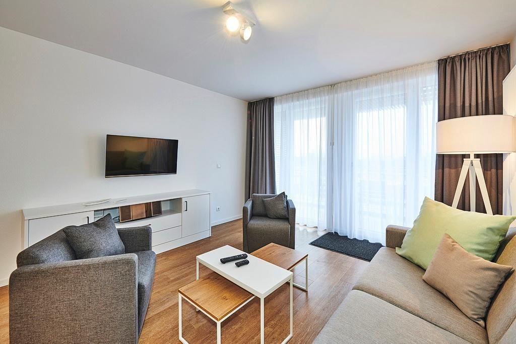 Das geschmackvoll eingerichtete Nichtraucher-Apartment verfügt über kostenfreies WLAN. Der Wohnbereich mit einer Schlafcouch bietet eine voll ausgestattete offene Küchenzeile mit Geschirrspüler, Gefrierfach, Kaffeemaschine, Toaster, Wasserkocher und Mikrowelle mit Backfunktion sowie einen großen Flatscreen-TV und ein Radio. Das Apartment verfügt über einen Esstisch für 5 Personen und einen behaglichen Sitzbereich. Zwei separate Schlafzimmer stehen euch zur Verfügung. Eines davon verfügt über ein Doppelbett und einen eigenen Flatscreen-TV, ein weiteres über ein Etagenbett. Ein Kinderbett kann gegen Entgelt aufgestellt werden. Im stilvollen Badezimmer befinden sich eine große begehbare Dusche sowie ein Waschtisch mit Föhn und Kosmetikspiegel. Nach einem erlebnisreichen Urlaubstag lässt sich auf dem überdachten und mit Gartenmöbeln ausgestatteten Balkon wunderbar entspannen.