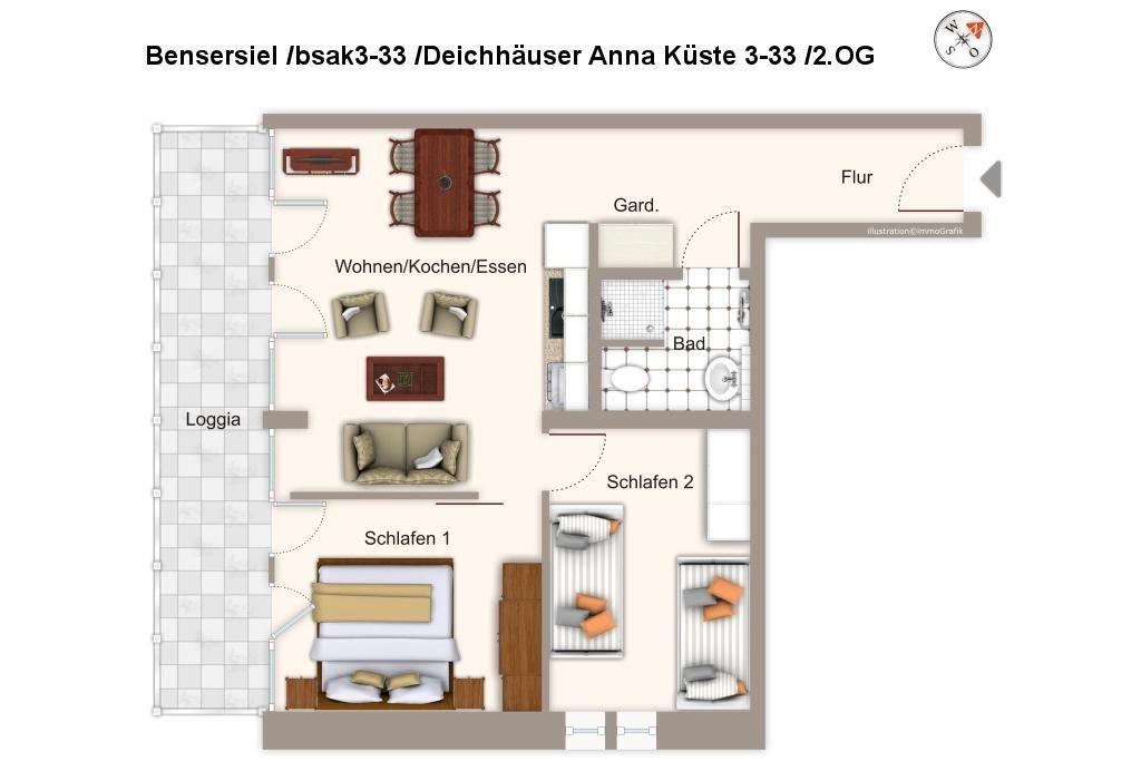 Die 55 m² große 3-Zimmer Ferienwohnung ist für bis zu 5 Personen geeignet. Besonders hervorzuheben ist der großzügige und überdachte Balkon, ähnlich einer Loggia, in sonniger West-Lage. Hier lässt sich bis zum Abend das wohltuende Meeresklima und die Sonne genießen.