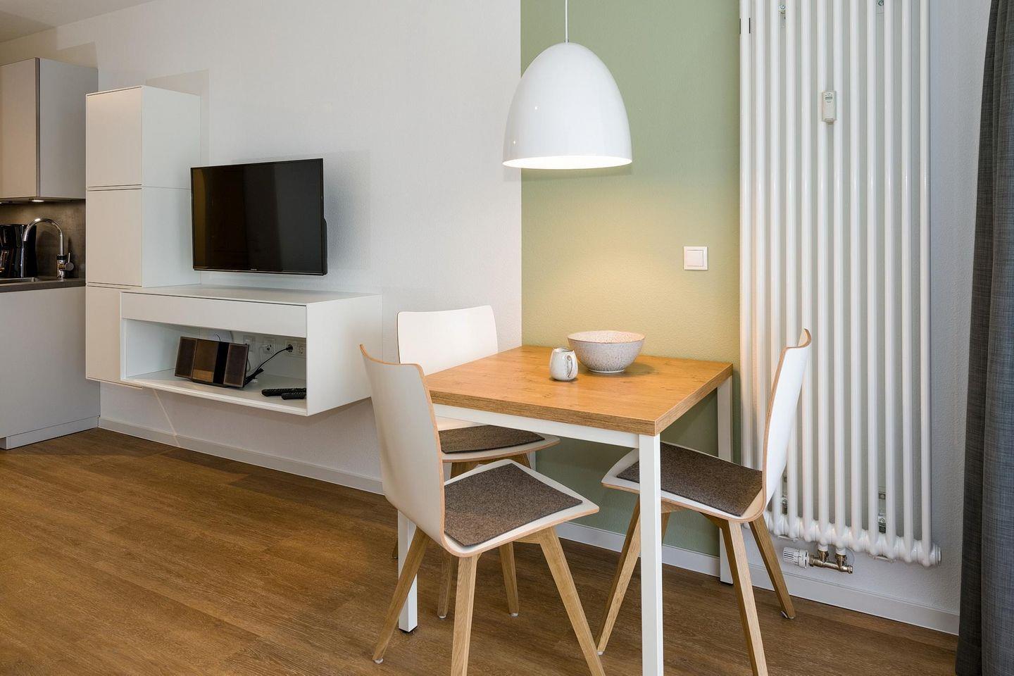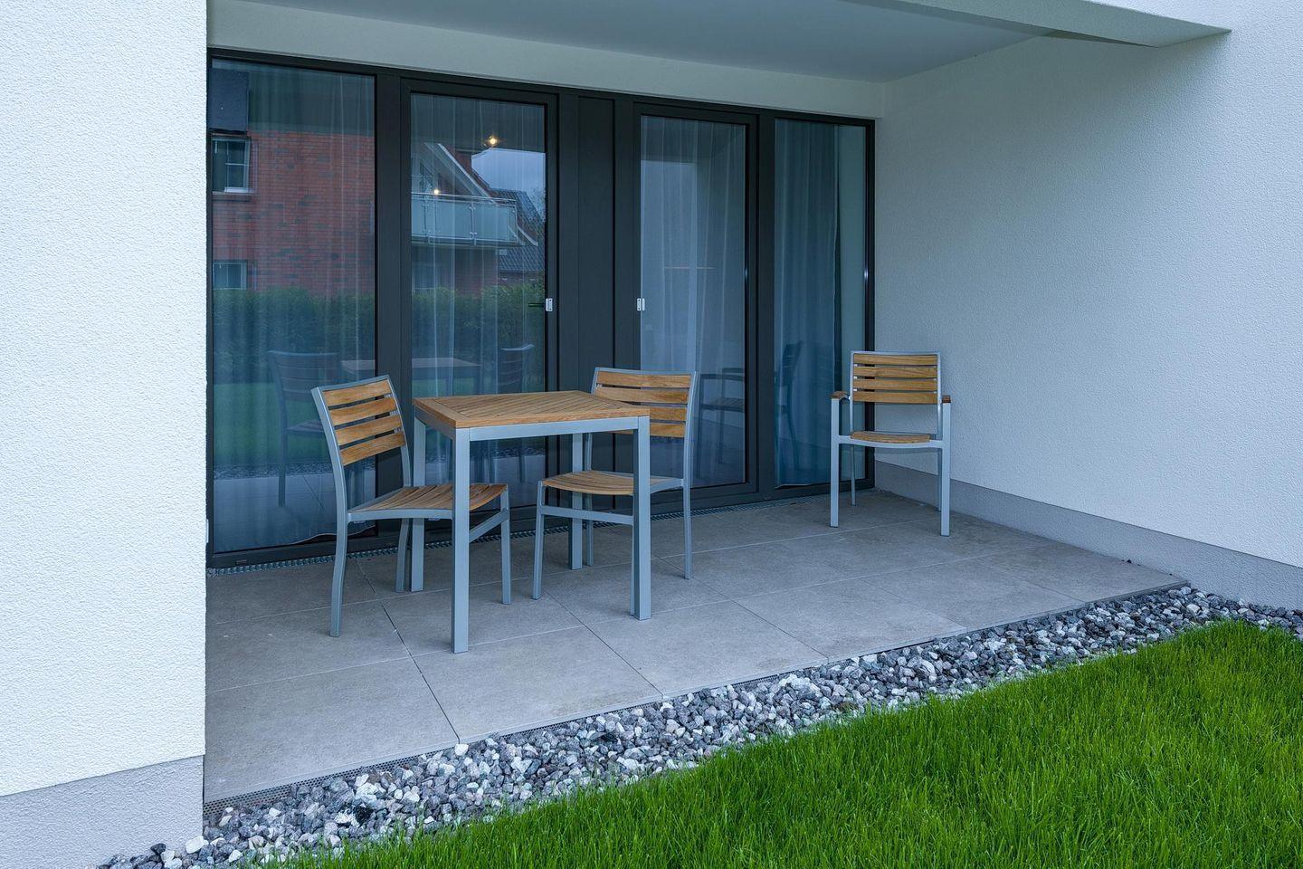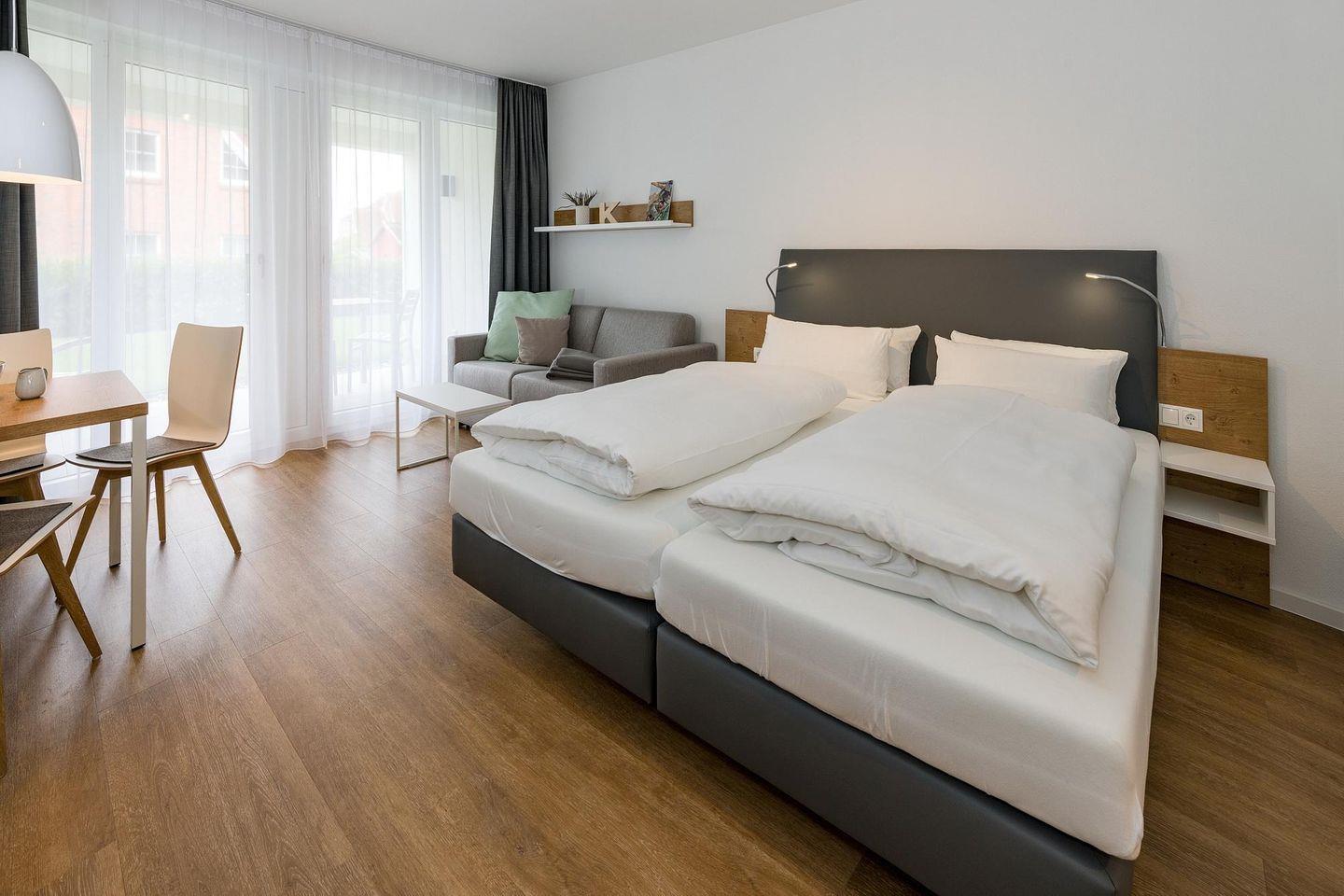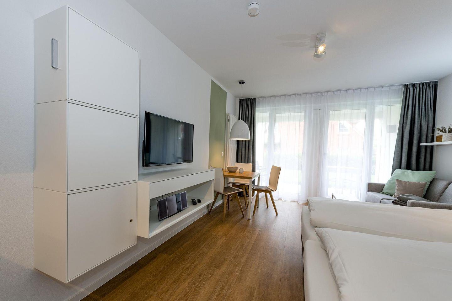 Das geschmackvoll eingerichtete Nichtraucher-Apartment verfügt über kostenfreies WLAN. Der Wohn-Schlafbereich bietet eine voll ausgestattete offene Küchenzeile mit Geschirrspüler, Gefrierfach, Kaffeemaschine, Toaster, Wasserkocher, Backofen und Mikrowelle sowie ein Doppelbett, einen großen Flatscreen-TV und ein Radio. Das Apartment verfügt über einen Esstisch für 3 Personen und einen behaglichen kleinen Sitzbereich. Ein Kinderbett kann gegen Entgelt aufgestellt werden. Im stilvollen Badezimmer befinden sich eine große begehbare Dusche sowie ein Waschtisch mit Föhn und Kosmetikspiegel. Nach einem erlebnisreichen Urlaubstag entspannt ihr auf der überdachten und mit Gartenmöbeln für 3 Personen ausgestatteten Terrasse.