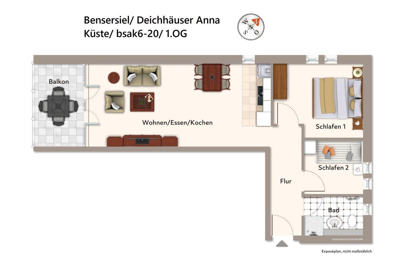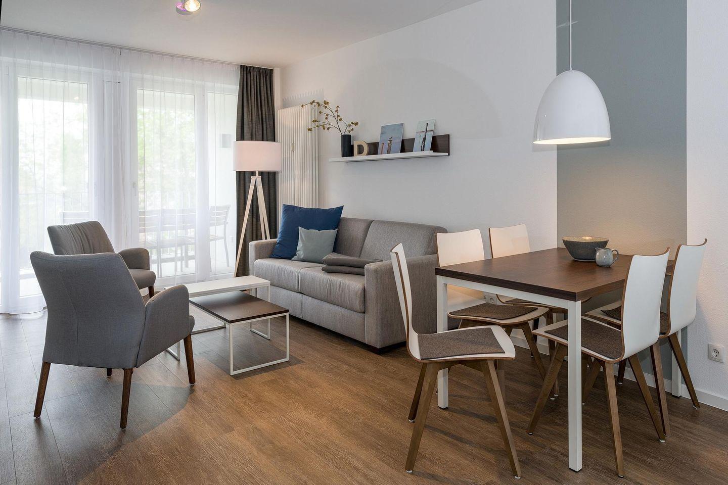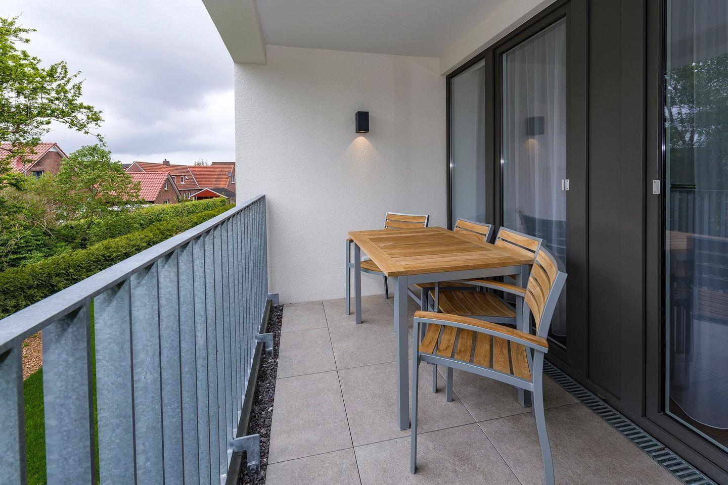Modernes, strandnahes Apartment in Bensersiel mit Balkon, Parkplatz und kostenfreiem Zugang zu Schwimmbad und Sauna.