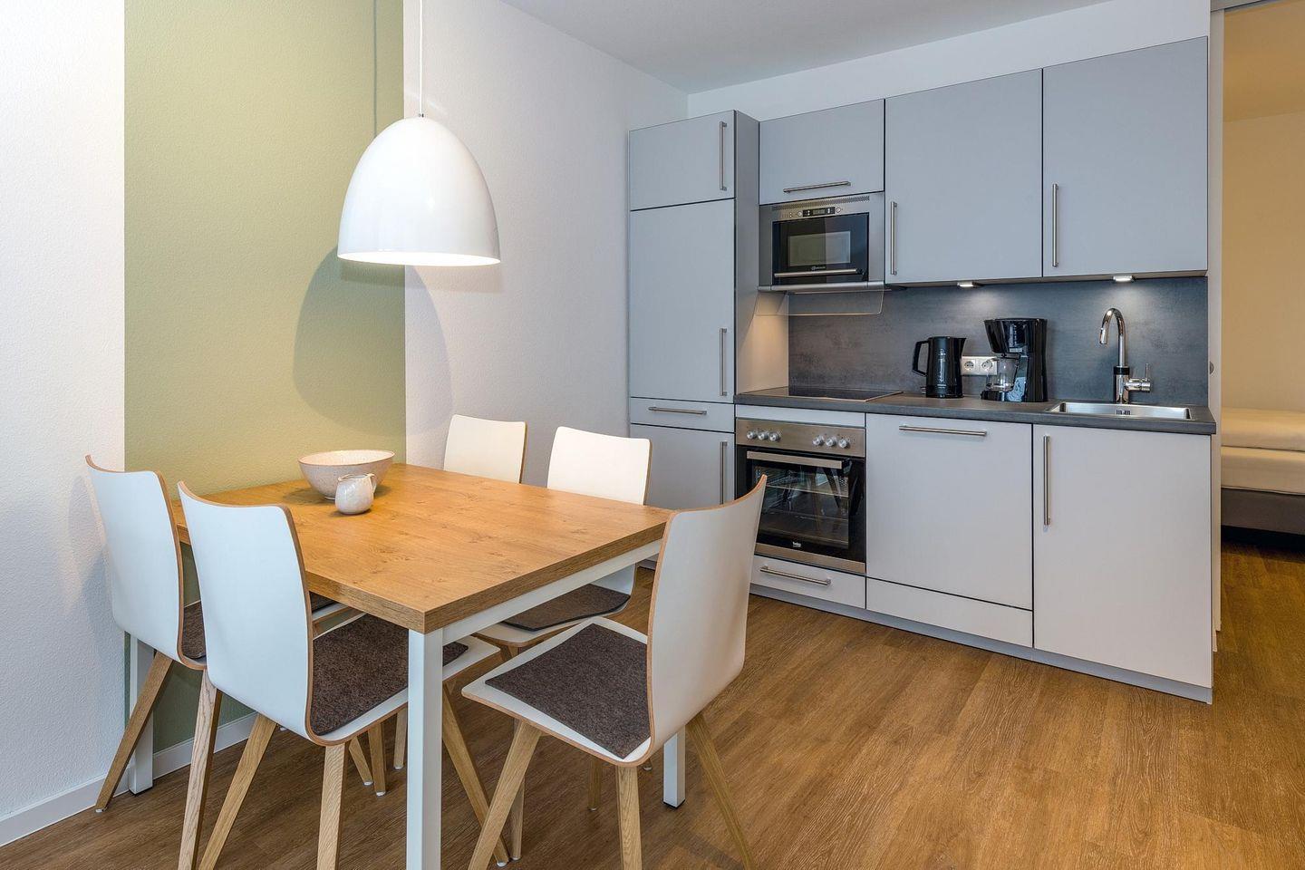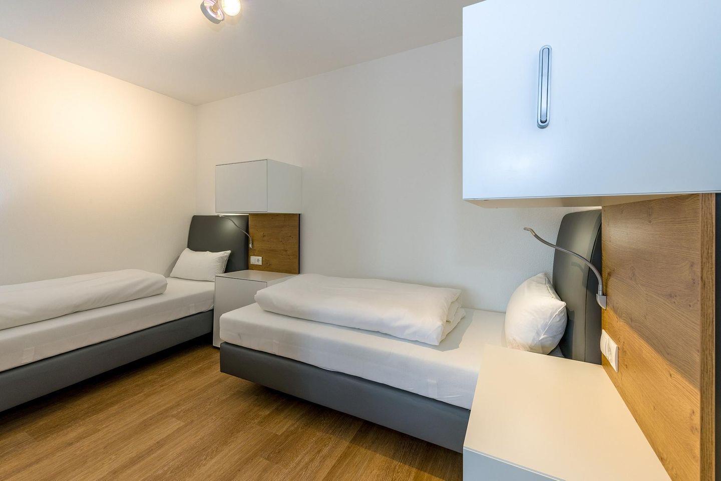 Das geschmackvoll eingerichtete Nichtraucher-Apartment verfügt über kostenfreies WLAN. Der Wohnbereich mit einer Schlafcouch bietet eine voll ausgestattete offene Küchenzeile mit Geschirrspüler, Gefrierfach, Backofen, Kaffeemaschine, Toaster, Wasserkocher und Mikrowelle sowie einen großen Flatscreen-TV und ein Radio. Das Apartment verfügt über einen Esstisch für 5 Personen und einen behaglichen Sitzbereich. Zwei separate Schlafzimmer stehen euch zur Verfügung. Eines davon verfügt über ein Doppelbett und einen eigenen Flatscreen-TV, ein weiteres Alkoven-Schlafzimmer über zwei Einzelbetten. Ein Kinderbett kann gegen Entgelt aufgestellt werden. Im stilvollen Badezimmer befinden sich eine große begehbare Dusche sowie ein Waschtisch mit Föhn und Kosmetikspiegel. Nach einem erlebnisreichen Urlaubstag entspannt ihr auf den überdachten und mit Gartenmöbeln für 5 Personen ausgestatteten Balkone. Die Balkone sind vom Wohnbereich bzw. vom Hauptschlafzimmer aus zugänglich.