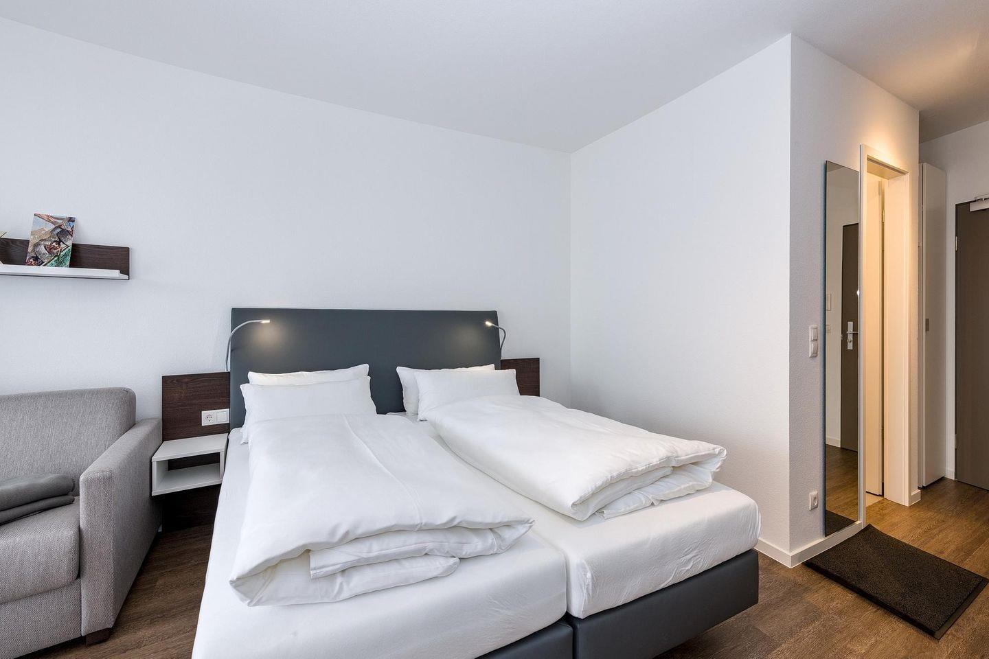Das geschmackvoll eingerichtete Nichtraucher-Apartment verfügt über kostenfreies WLAN. Der Wohn-Schlafbereich bietet eine voll ausgestattete offene Küchenzeile mit Geschirrspüler, Gefrierfach, Backofen, Kaffeemaschine, Toaster, Wasserkocher und Mikrowelle sowie ein Doppelbett, einen großen Flatscreen-TV und ein Radio. Das Apartment verfügt über einen Esstisch für 3 Personen und einen behaglichen kleinen Sitzbereich mit Schlafcouch. Ein Kinderbett kann gegen Entgelt aufgestellt werden. Im stilvollen Badezimmer befinden sich eine große begehbare Dusche sowie ein Waschtisch mit Föhn und Kosmetikspiegel. Nach einem erlebnisreichen Urlaubstag entspannt ihr auf der überdachten und mit Gartenmöbeln für 3 Personen ausgestatteten Balkon.