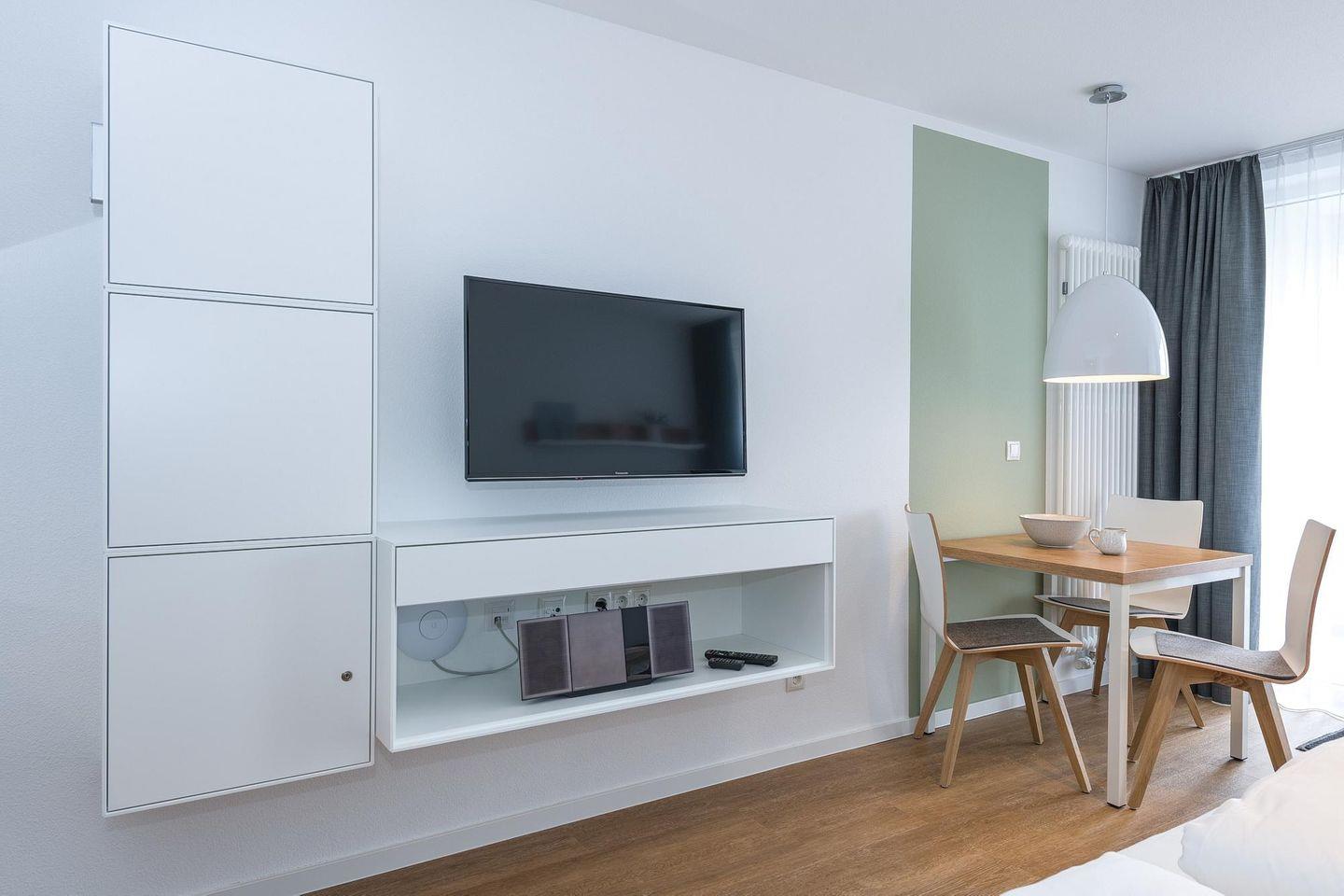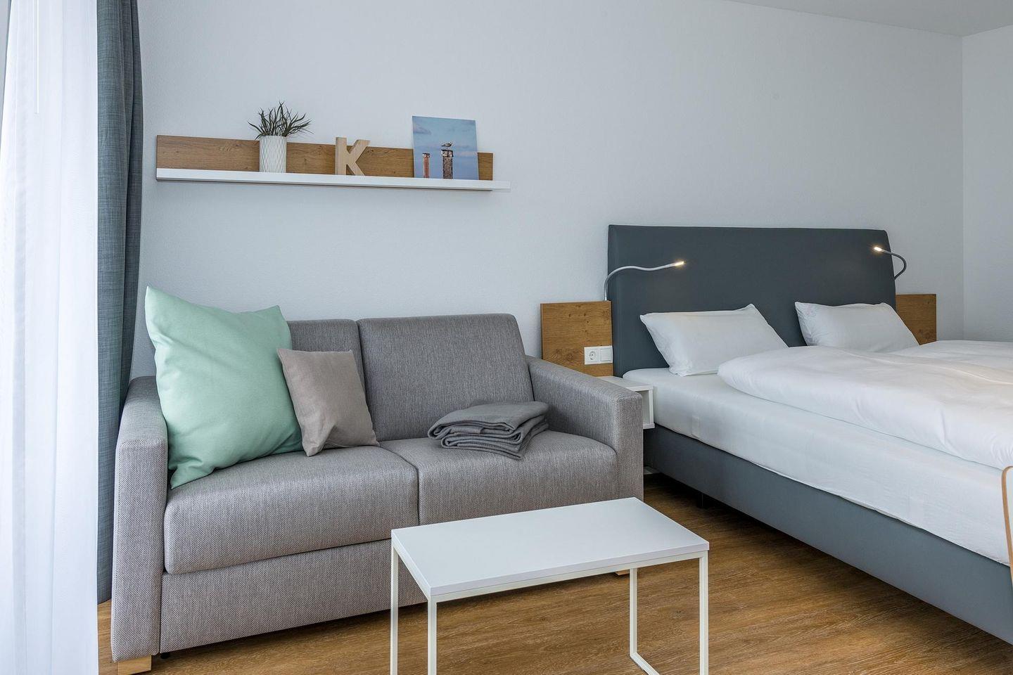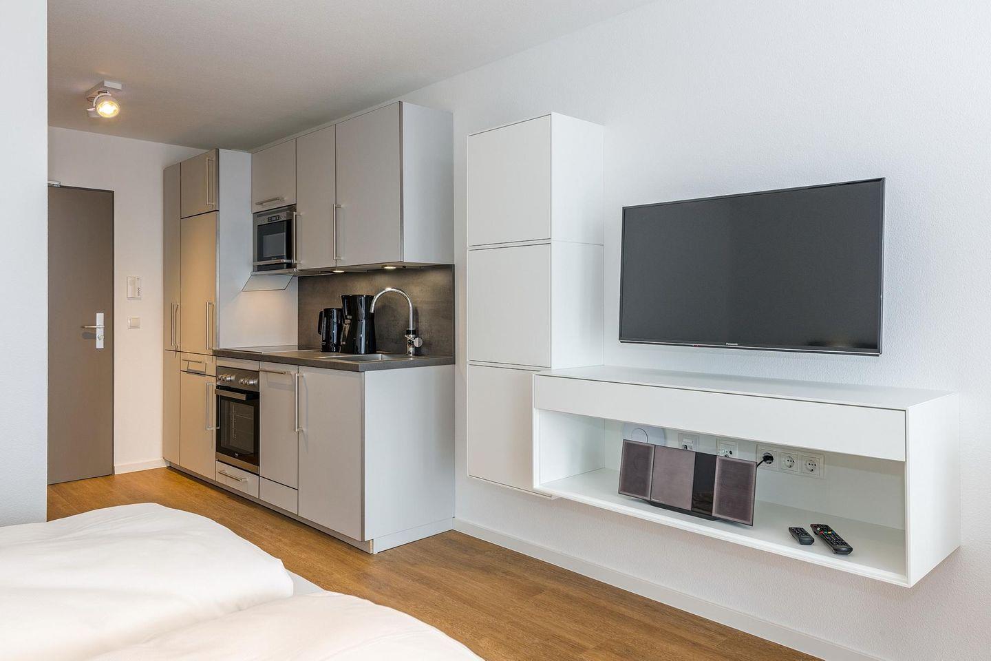 Das geschmackvoll eingerichtete Nichtraucher-Apartment verfügt über kostenfreies WLAN. Der Wohn-Schlafbereich mit Schlafcouch, bietet eine voll ausgestattete offene Küchenzeile mit Geschirrspüler, Backofen, Gefrierfach, Kaffeemaschine, Toaster, Wasserkocher und Mikrowelle sowie ein Doppelbett, einen großen Flatscreen-TV und ein Radio. Das Apartment verfügt über einen Esstisch für 3 Personen und einen behaglichen kleinen Sitzbereich. Im stilvollen Badezimmer befinden sich eine große begehbare Dusche sowie ein Waschtisch mit Föhn und Kosmetikspiegel. Nach einem erlebnisreichen Urlaubstag entspannt ihr auf dem überdachten und mit Gartenmöbeln für 3 Personen ausgestatteten Balkon.