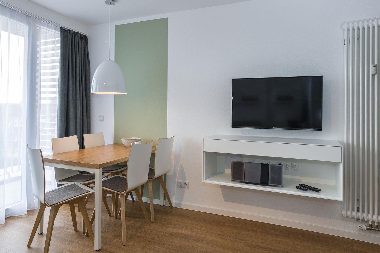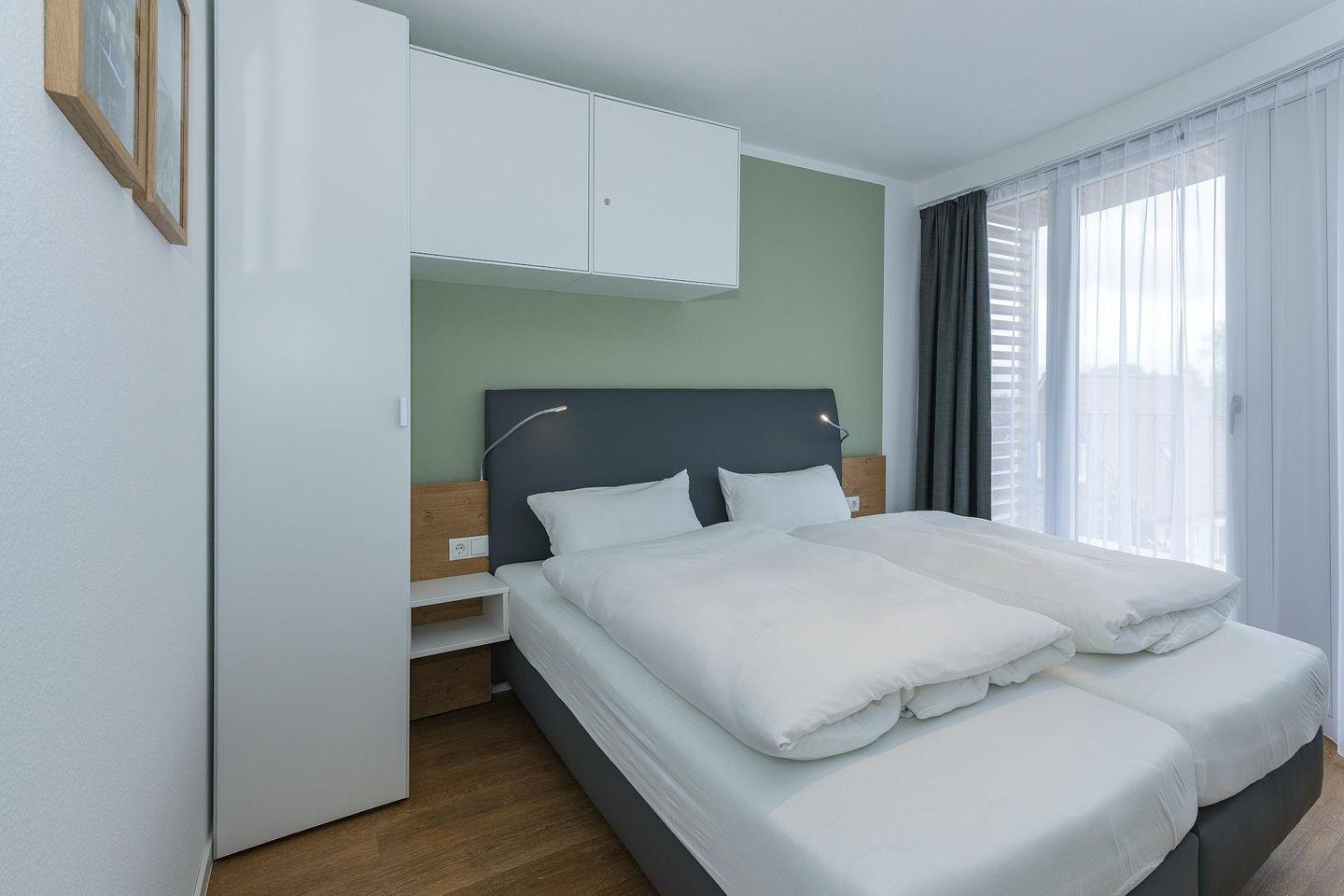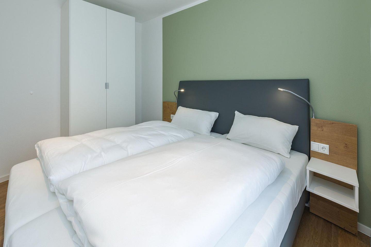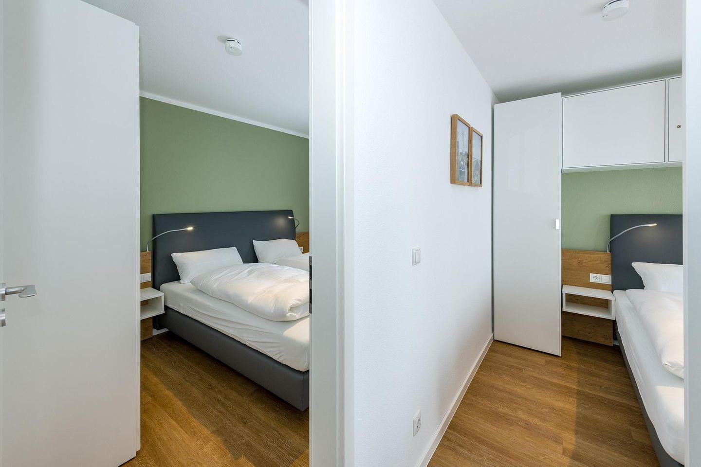 Das geschmackvoll eingerichtete Nichtraucher-Apartment verfügt über kostenfreies WLAN. Der Wohnbereich mit Schlafcouch bietet eine voll ausgestattete offene Küchenzeile mit Geschirrspüler, Gefrierfach, Backofen, Kaffeemaschine, Toaster, Wasserkocher und Mikrowelle sowie einen großen Flatscreen-TV und ein Radio. Das Apartment verfügt über einen Esstisch für 5 Personen und einen behaglichen Sitzbereich. Zwei separate Schlafzimmer mit jeweils einem Doppelbett stehen euch zur Verfügung. Eines davon verfügt zudem über einen eigenen Flatscreen-TV. Im stilvollen Badezimmer befinden sich eine große begehbare Dusche sowie ein Waschtisch mit Föhn und Kosmetikspiegel. Nach einem erlebnisreichen Urlaubstag entspannt ihr auf dem überdachten und mit Gartenmöbeln für 5 Personen ausgestatteten Balkon..