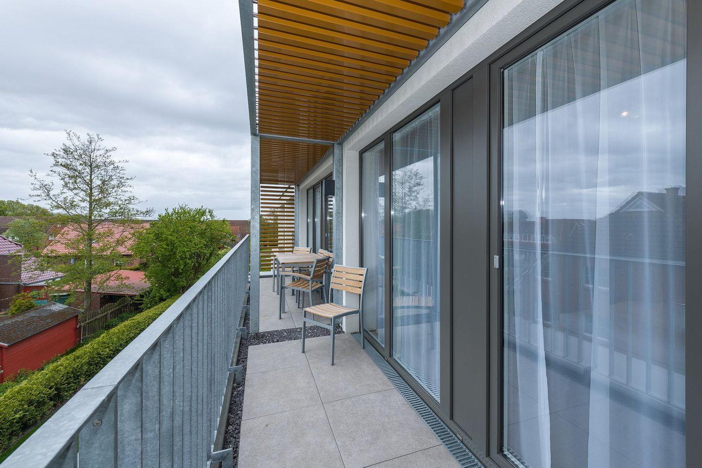 Modernes Apartment in Bensersiel mit großem Balkon, Schwimmbad- und Saunanutzung nahe Nordsee und Strand.